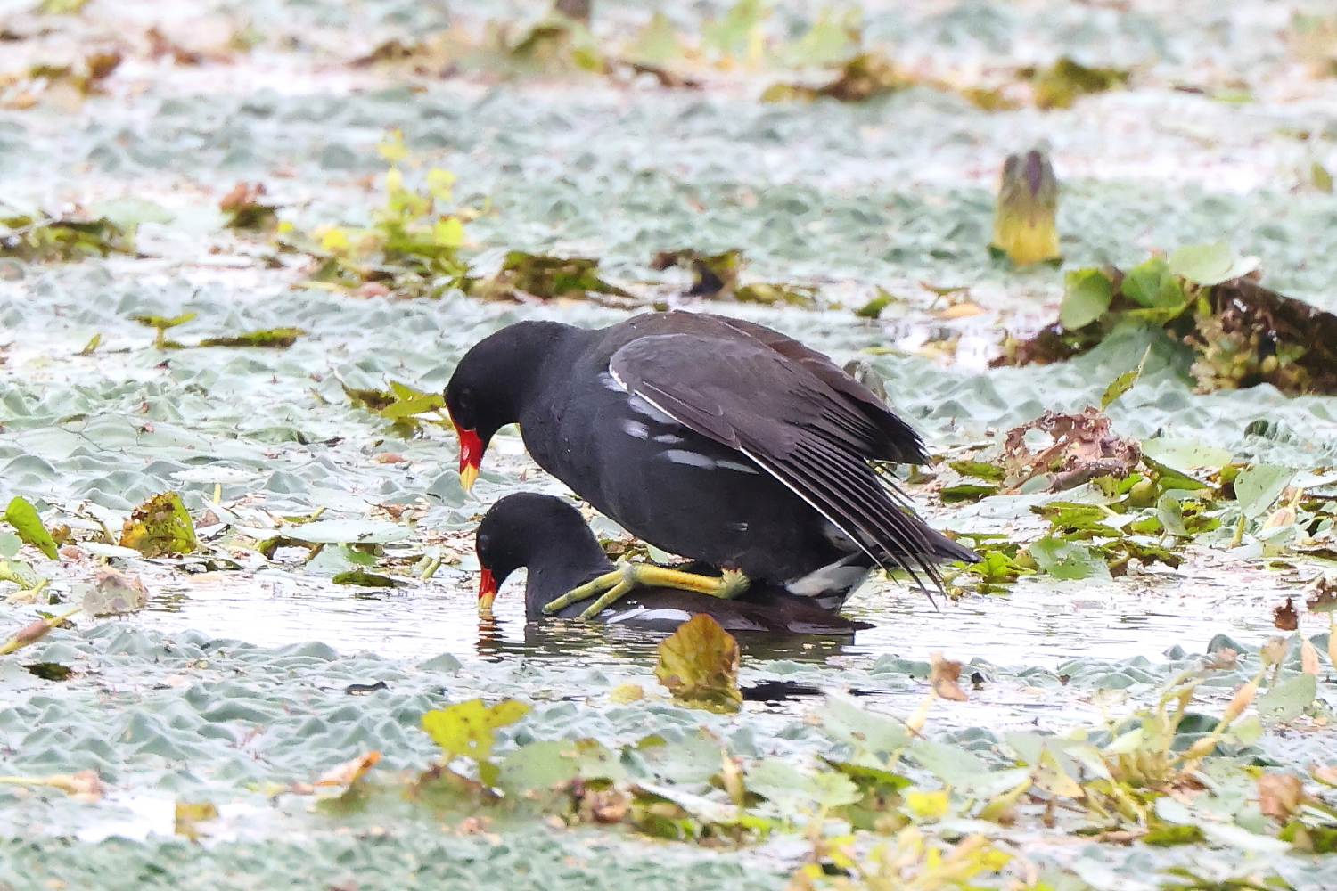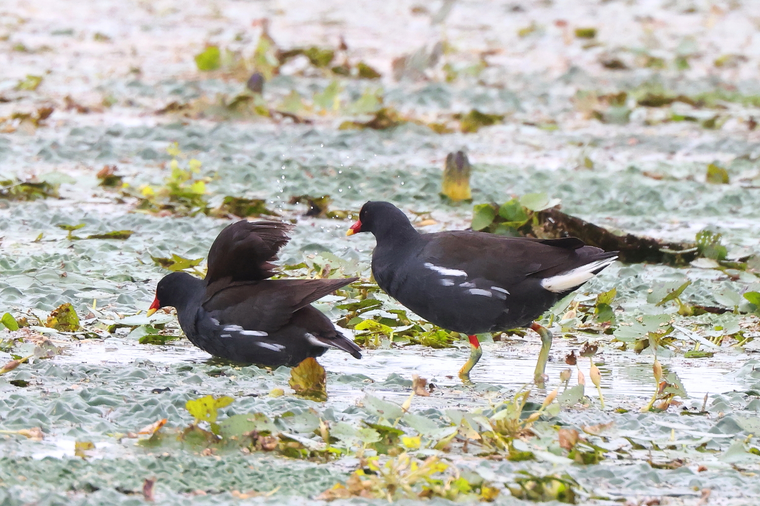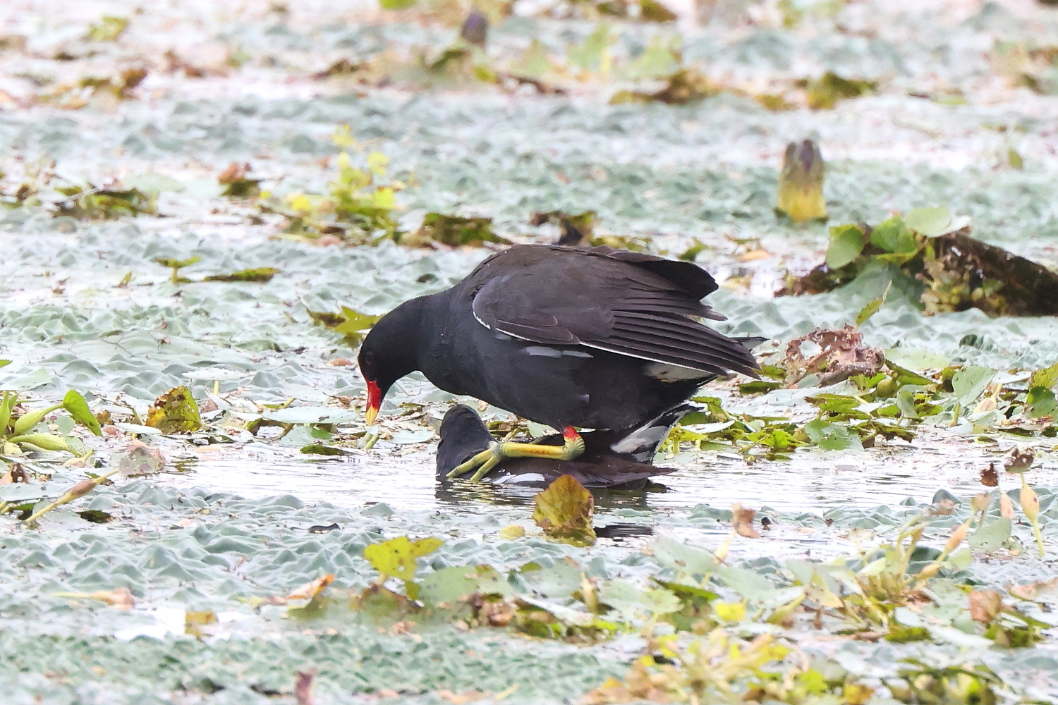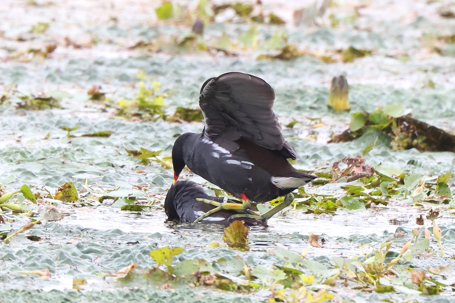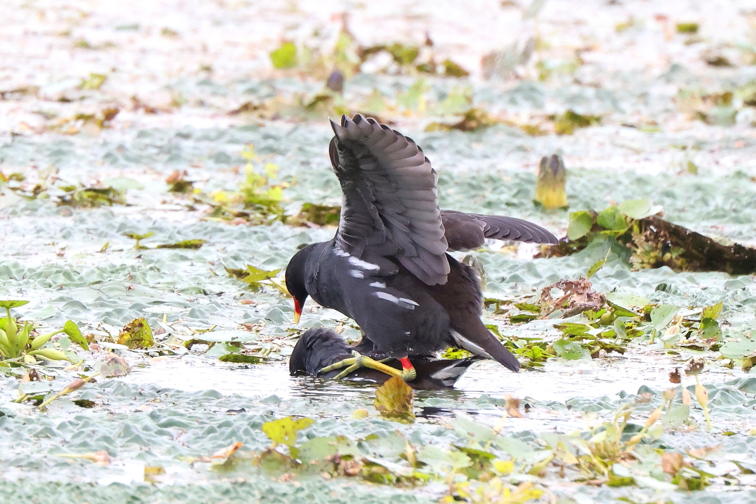 大泉緑地公園近くの池で「バン」が、堂々と交尾をしていました(^-^) 岸和田の大池では、10年くらい前からオオバンが幅を効かせて、最近では「バン」を観る機会が殆どなくなってしまいましたが、堺市のこの池では「バン」がたくさんで観られ、先日は池の真ん中で堂々と交尾を始めました^^ ※Canon EOS R5+RF100-500mm F4.5-7.1 L IS USM+1.4x 三脚撮影 ※Canon EOS 7D MarkⅡ+100-400mm F4.5-5.6L ISⅡ+1.4x 手持ち撮影(ふうさん)