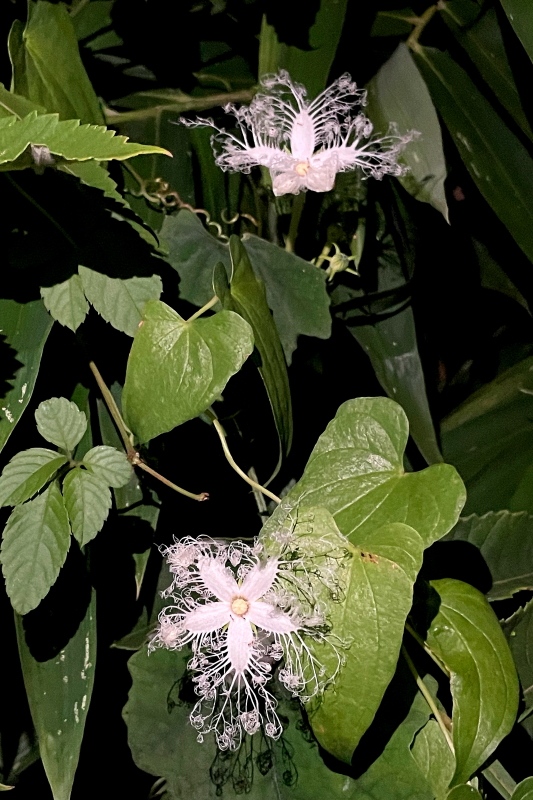 今年も花の時期になったので、所用を済ませてから帰りに立ち寄ってみると、月明かりがなかったせいか、完全にレース状の花の先まで開いていませんでしたが、それでも4輪ほど花が咲いていたので、スマホの照明で撮影して帰りました。