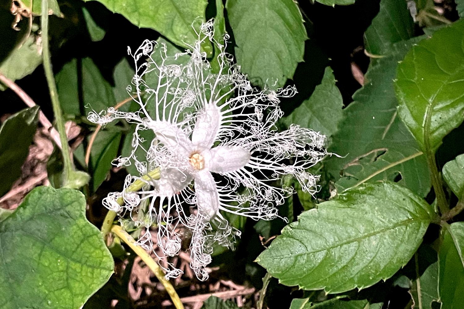 ☆近所の道路沿いで夜間に綺麗な白いレース状の花を咲かせていた「カラスウリの花」