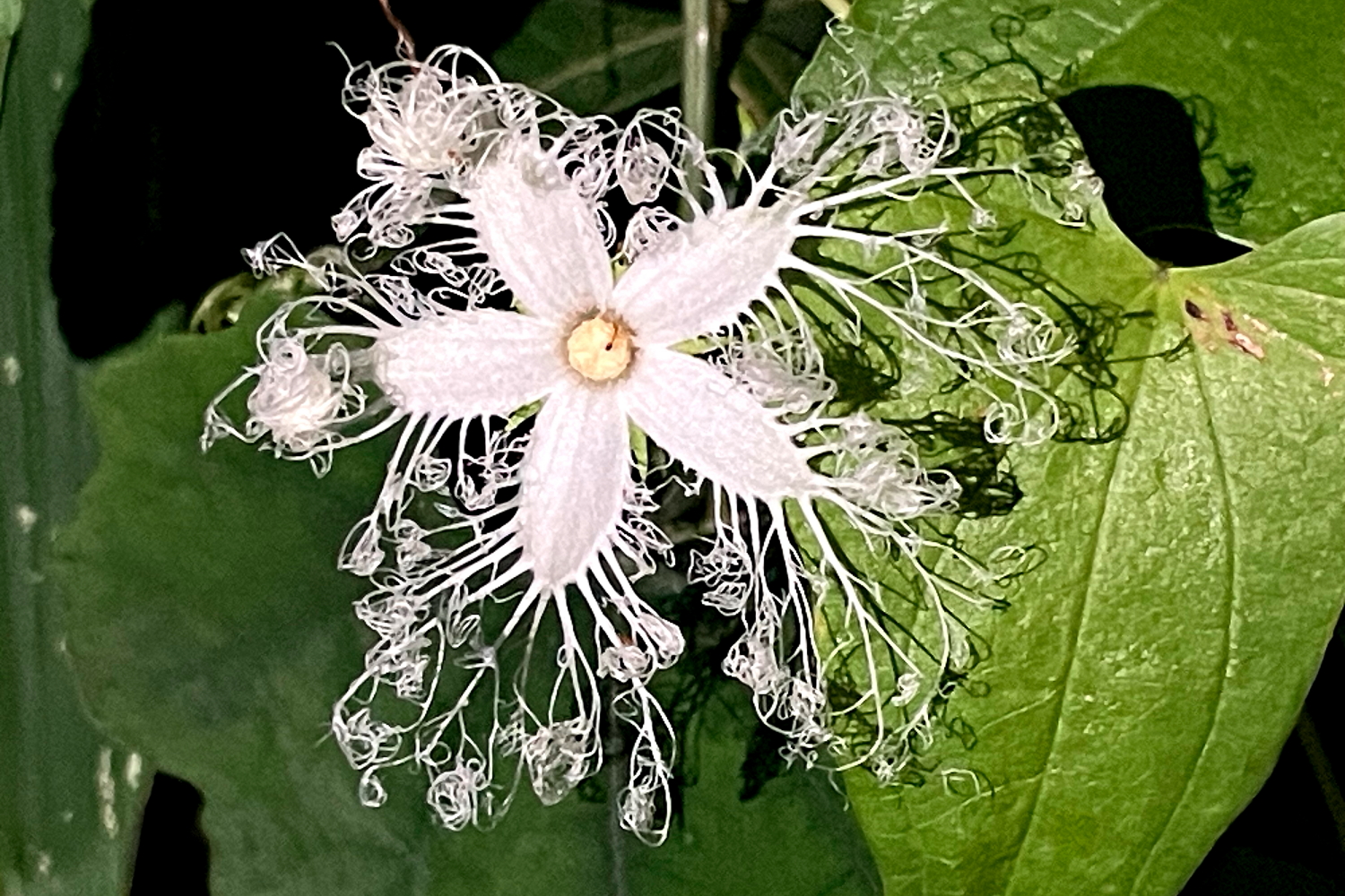 (本日更新2)近所の道路沿いで、昨日の夜間に綺麗なレース状の花を咲かせていた「カラスウリの花」です(^-^)