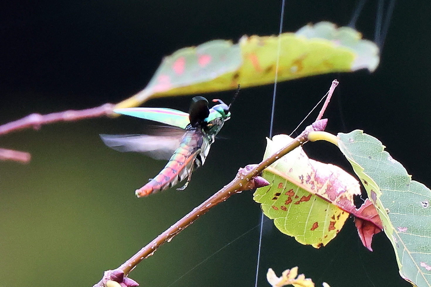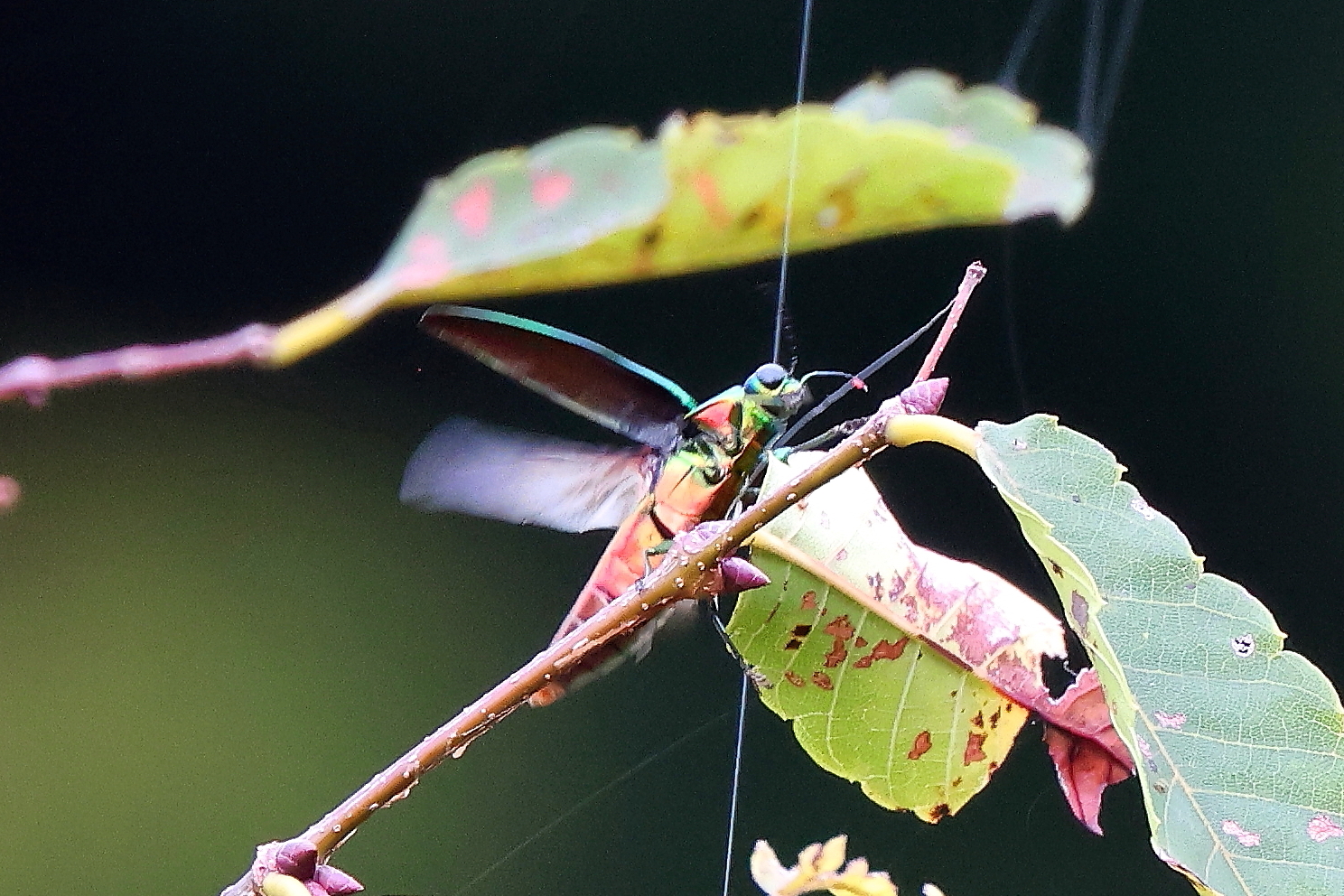 岩湧の森でムツバセイボウの登場を待っていると、遠くのクヌギの葉に「タマムシ」が留ったので撮っていると、直ぐに飛び去ってしまいました(^-^)
