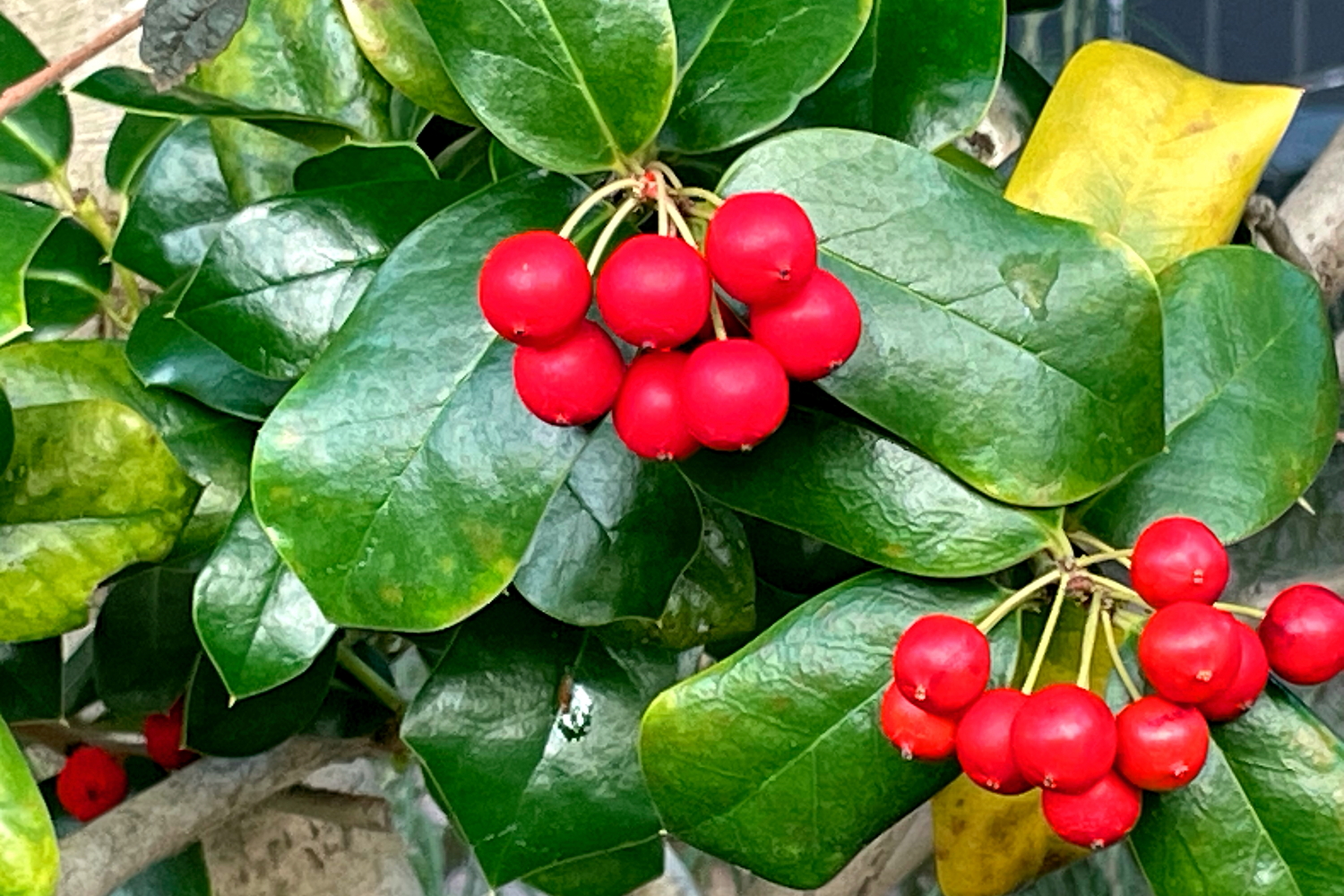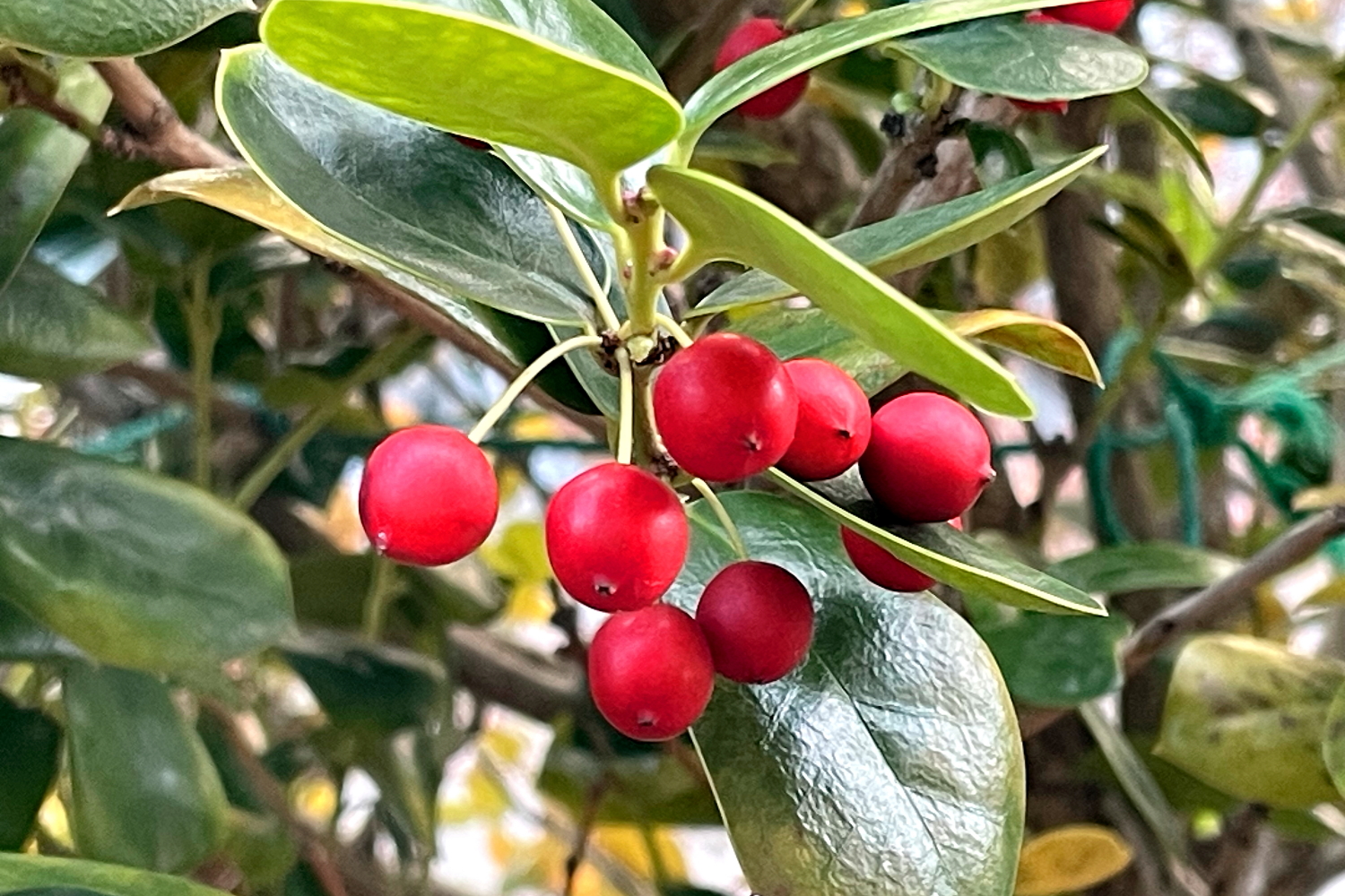 クリスマスホーリーは、クリスマスの頃に実が赤く染まるので、リースなどに魔よけの装飾用として利用されています。