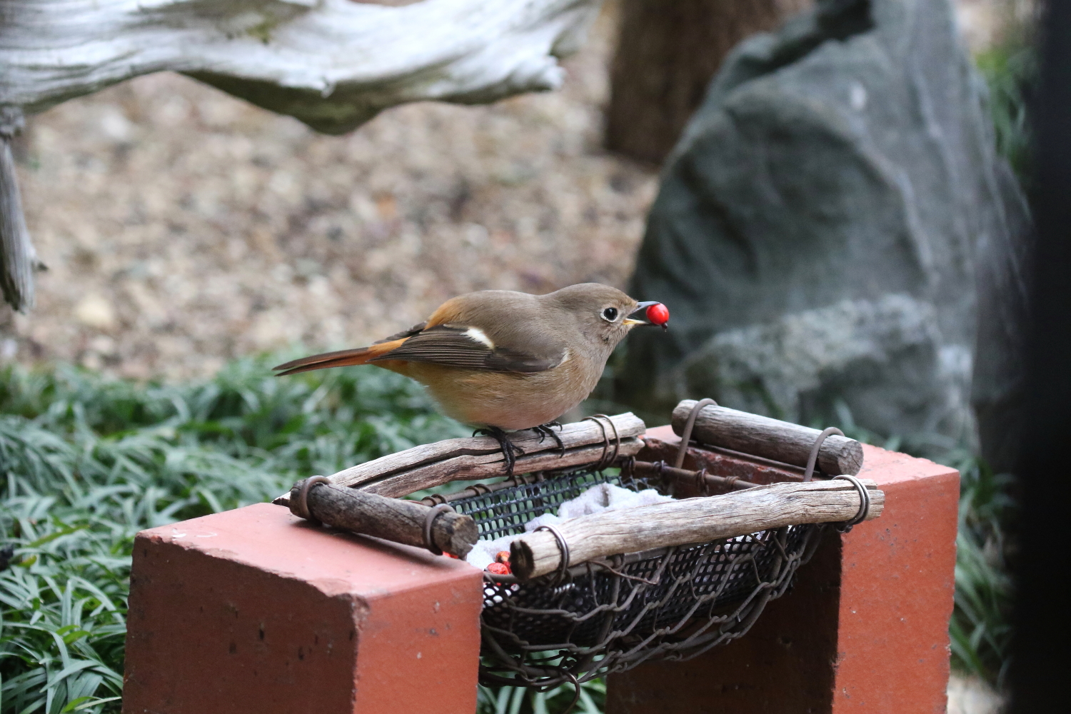 (本日更新1)お庭で放し飼い中の「ジョウビタキ♀」が、エサ台で大好物の花水木の実を採餌していました(^-^)