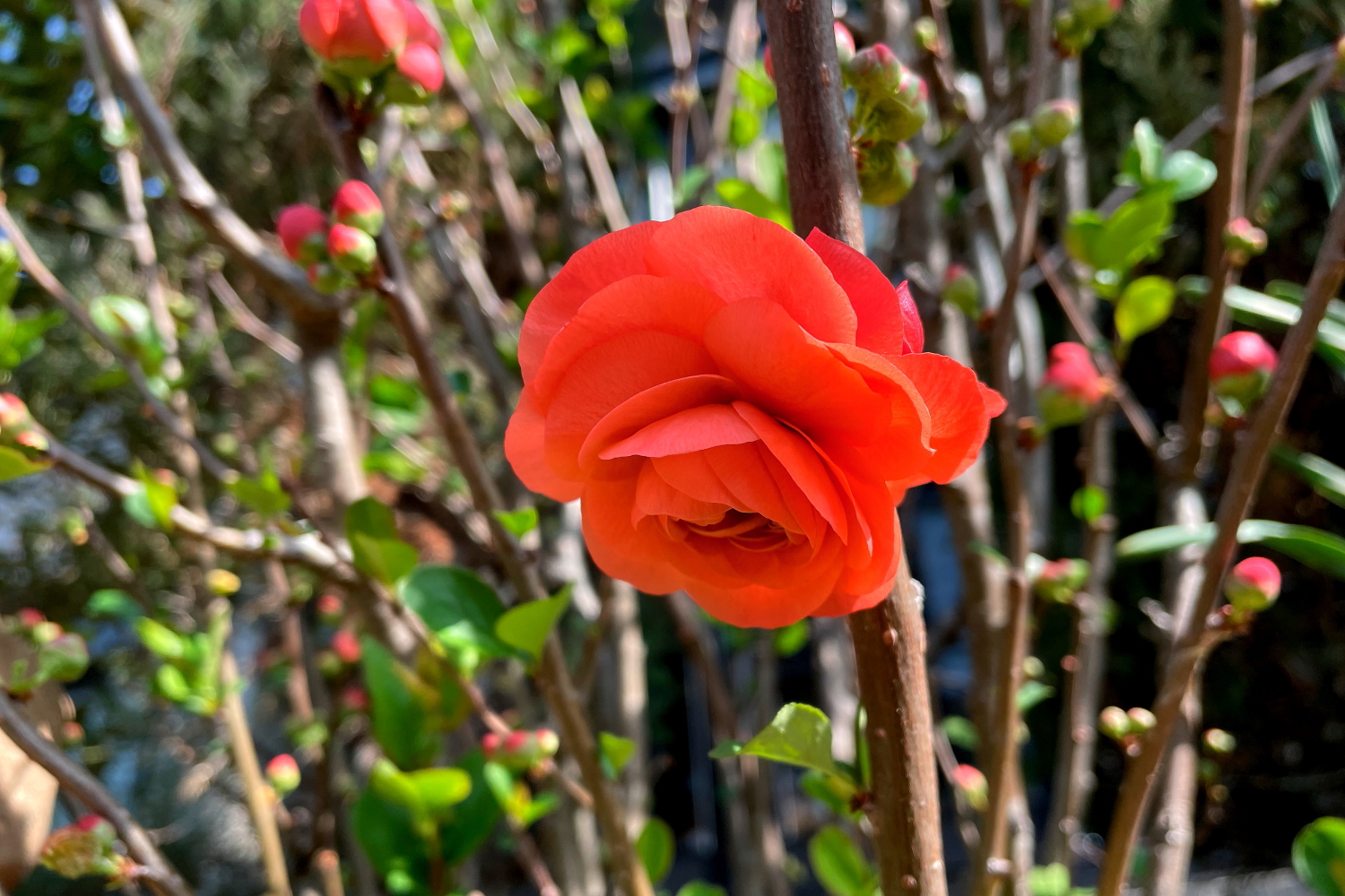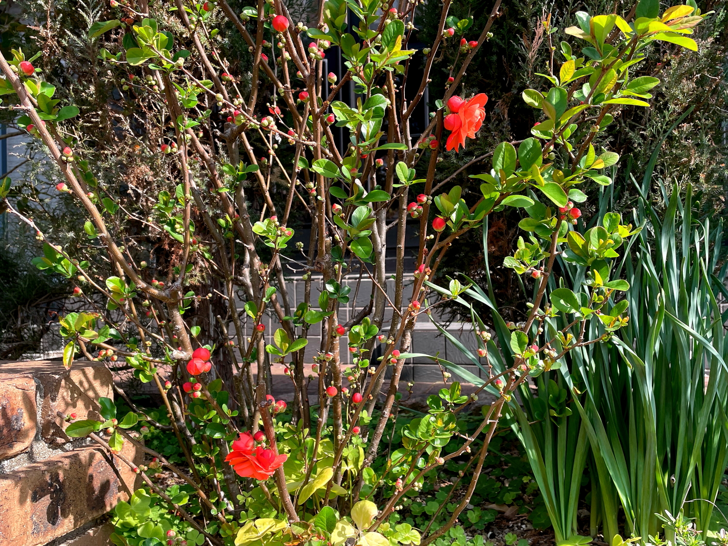 (本日更新1)お庭で大輪の「ボケの花」が、たくさん花芽をつけていましたが、このところの陽気で、一機に花が咲き出しました(^-^)