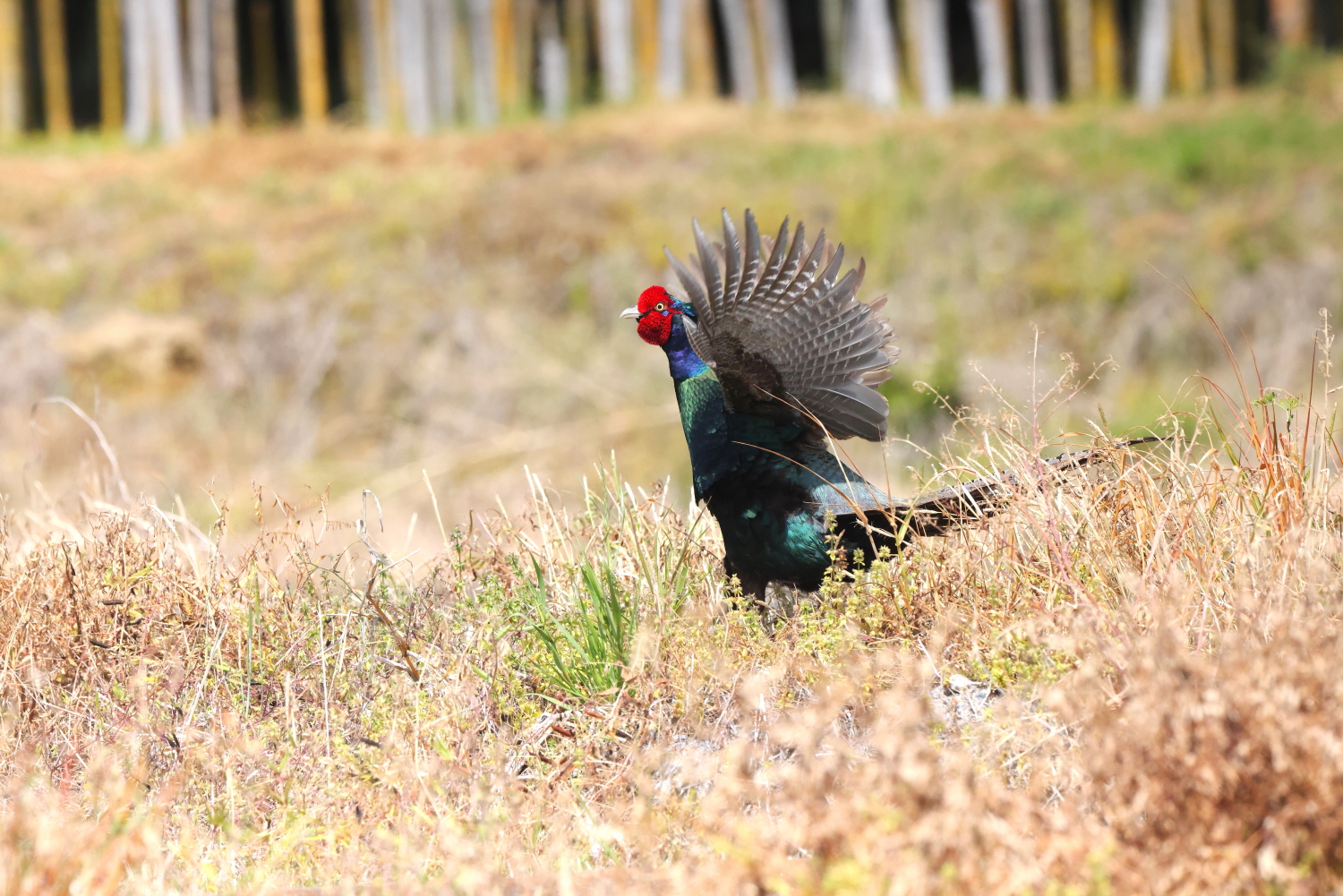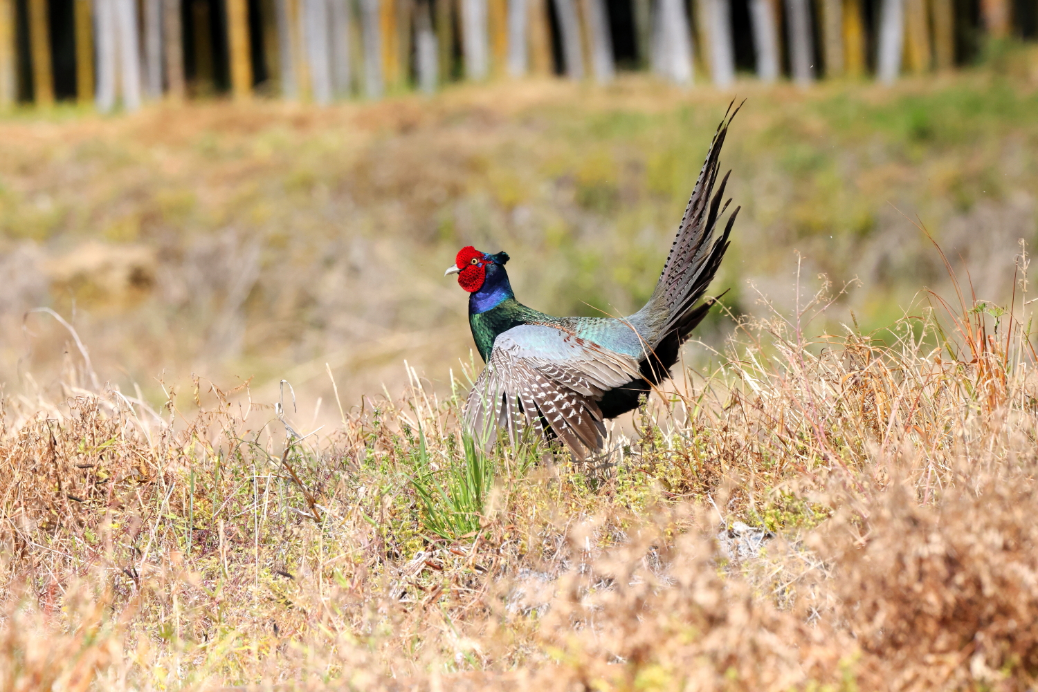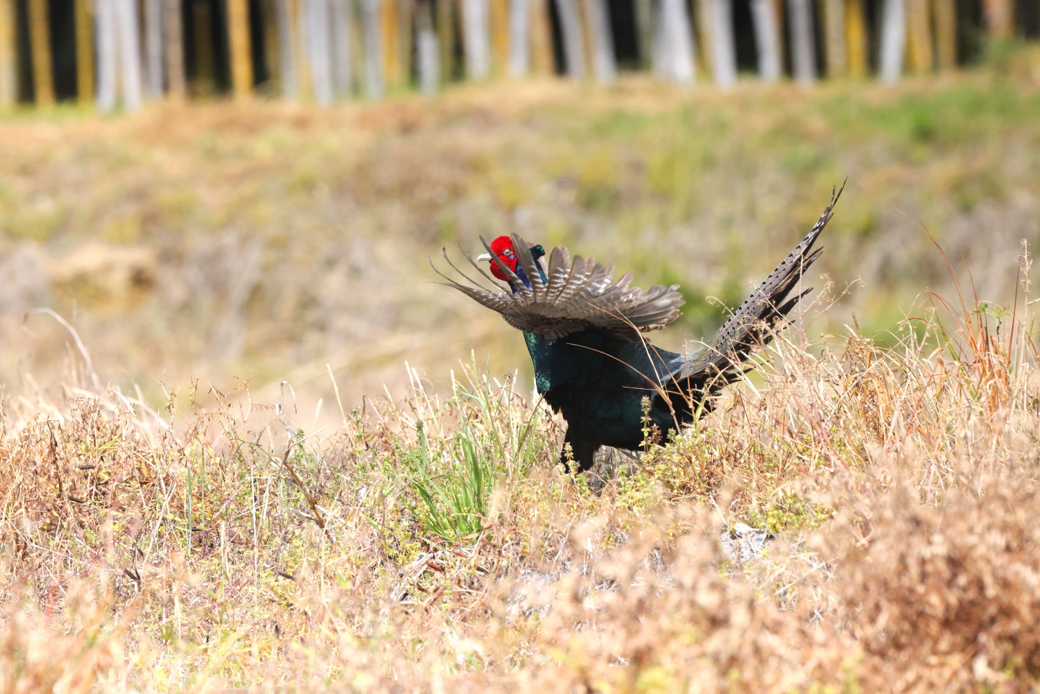 数日前にキジの母衣打ちを今季初撮りできましたが、午後の強い西日で影の中だったので、今回は順光の中で撮れないかと期待して出かけてきたところ、予想通り順光のもとにキジが出て来てくれて、母衣打ちをしてくれました^^