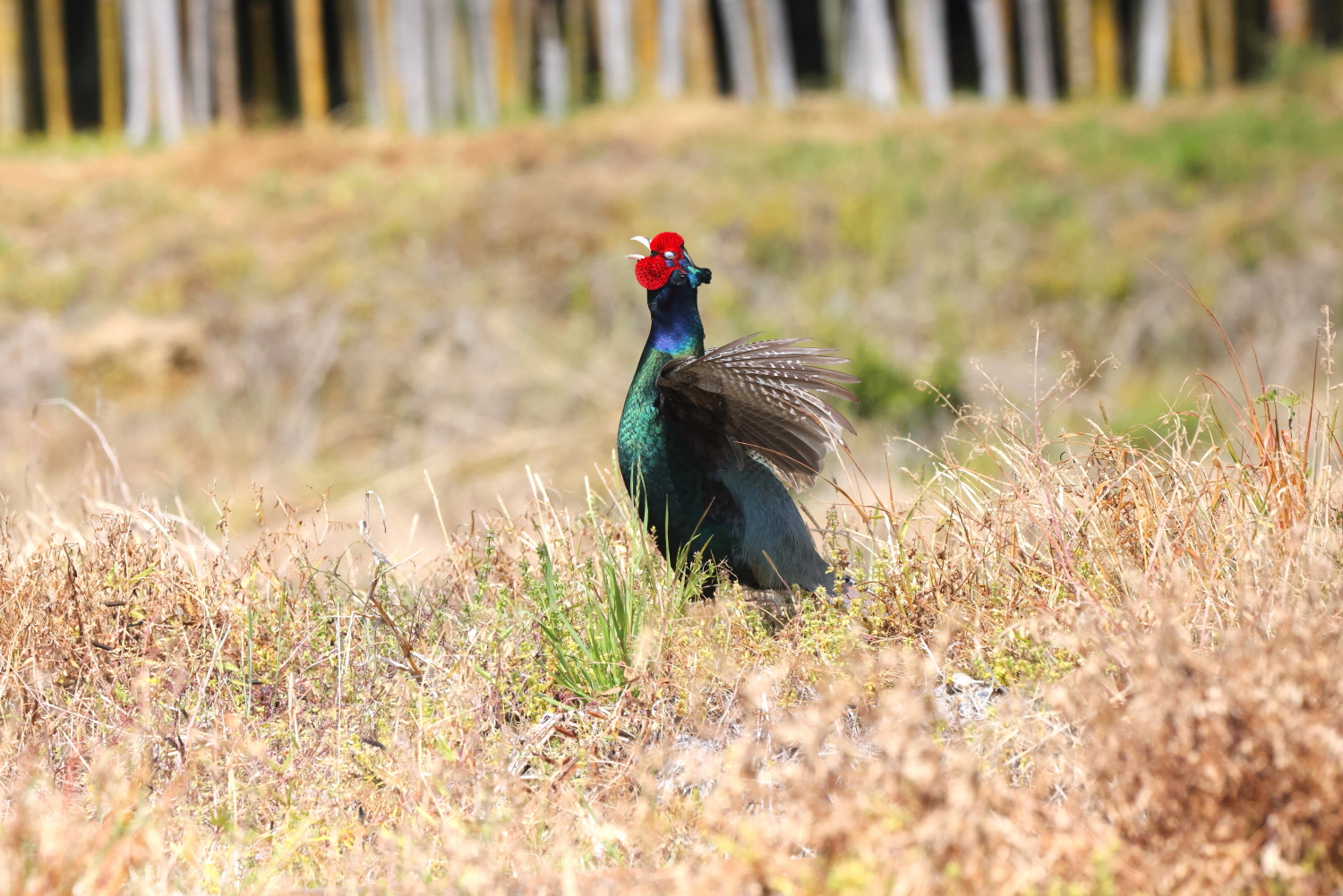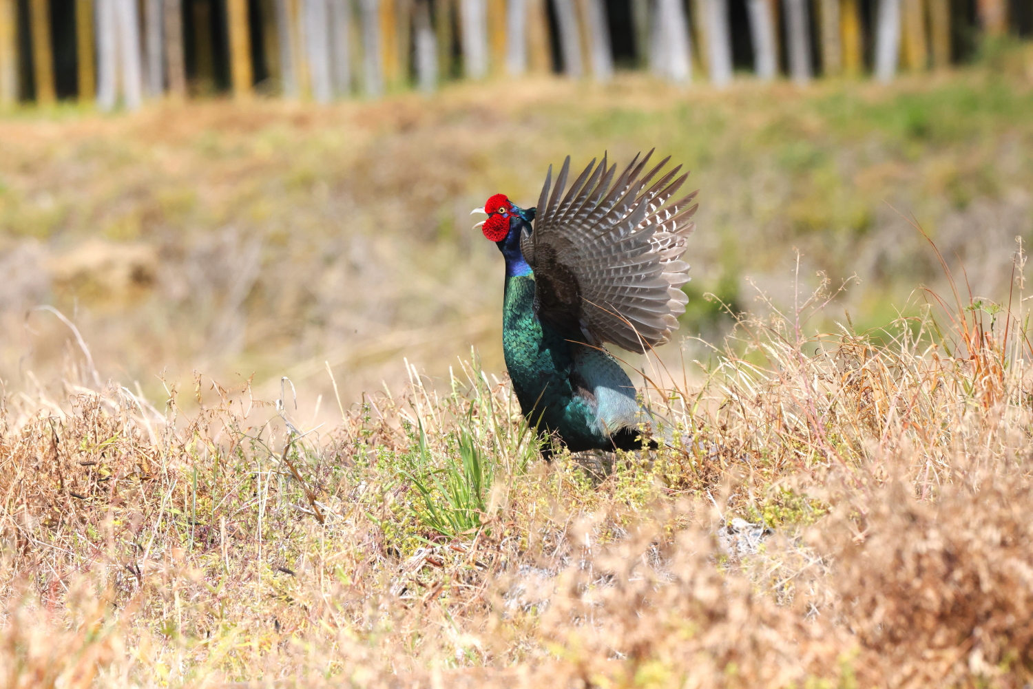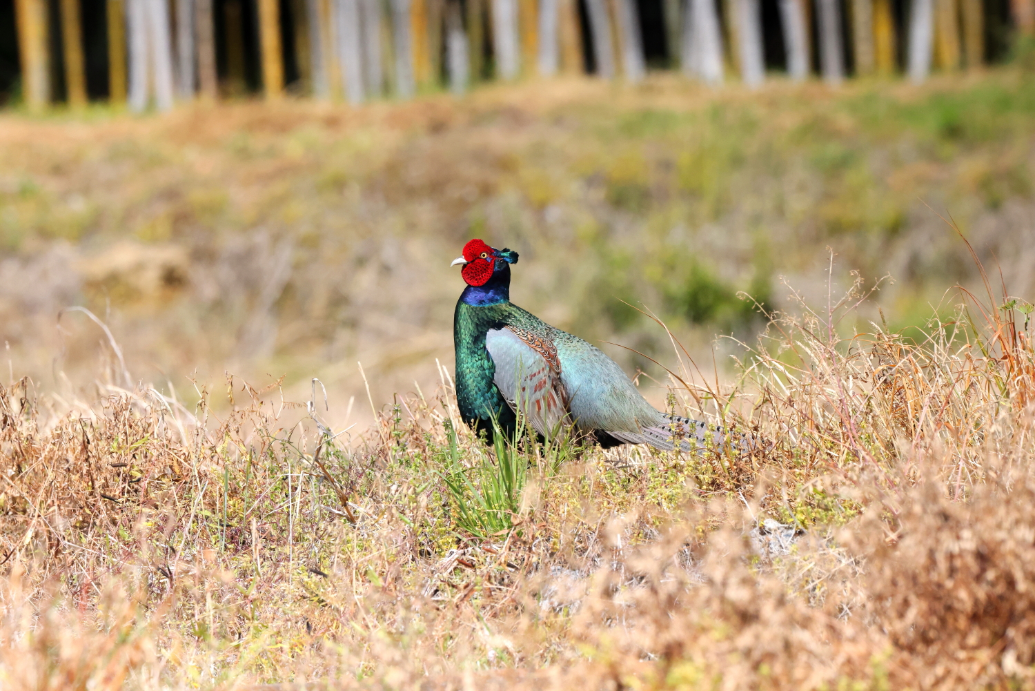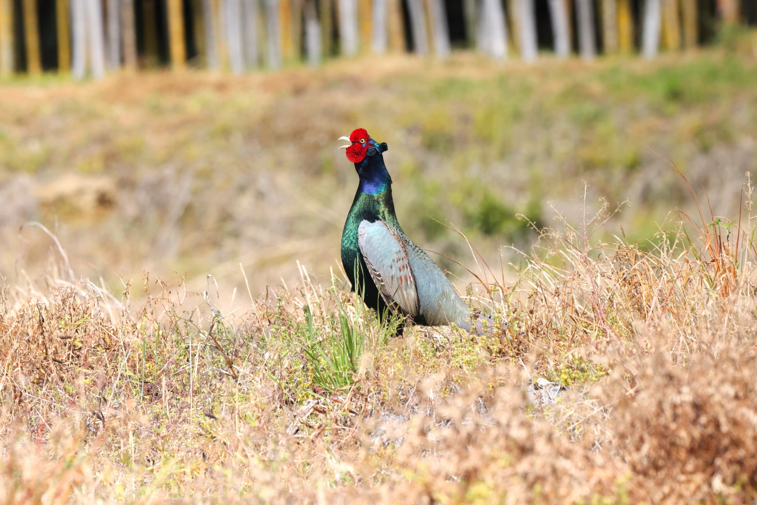 数日前にキジの母衣打ちを今季初撮りできましたが、午後の強い西日で影の中だったので、今回は順光の中で撮れないかと期待して出かけてきたところ、予想通り順光のもとにキジが出て来てくれて、母衣打ちをしてくれました^^