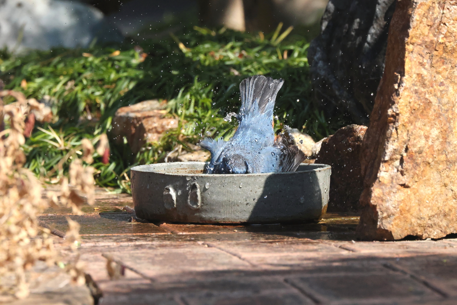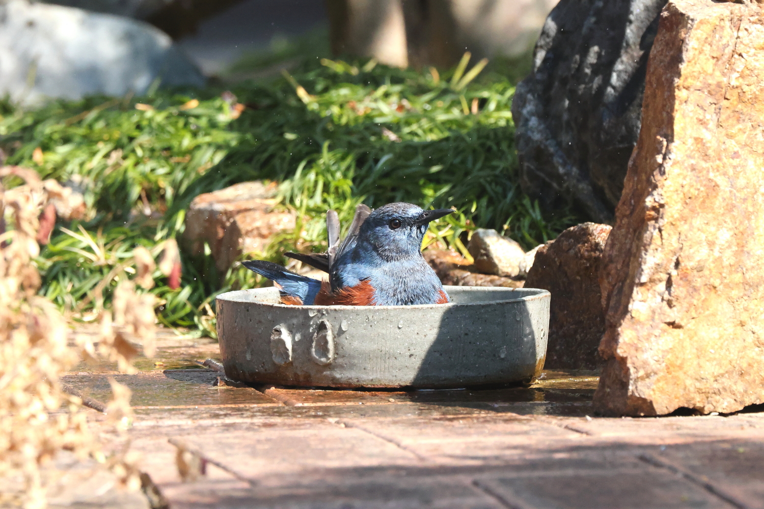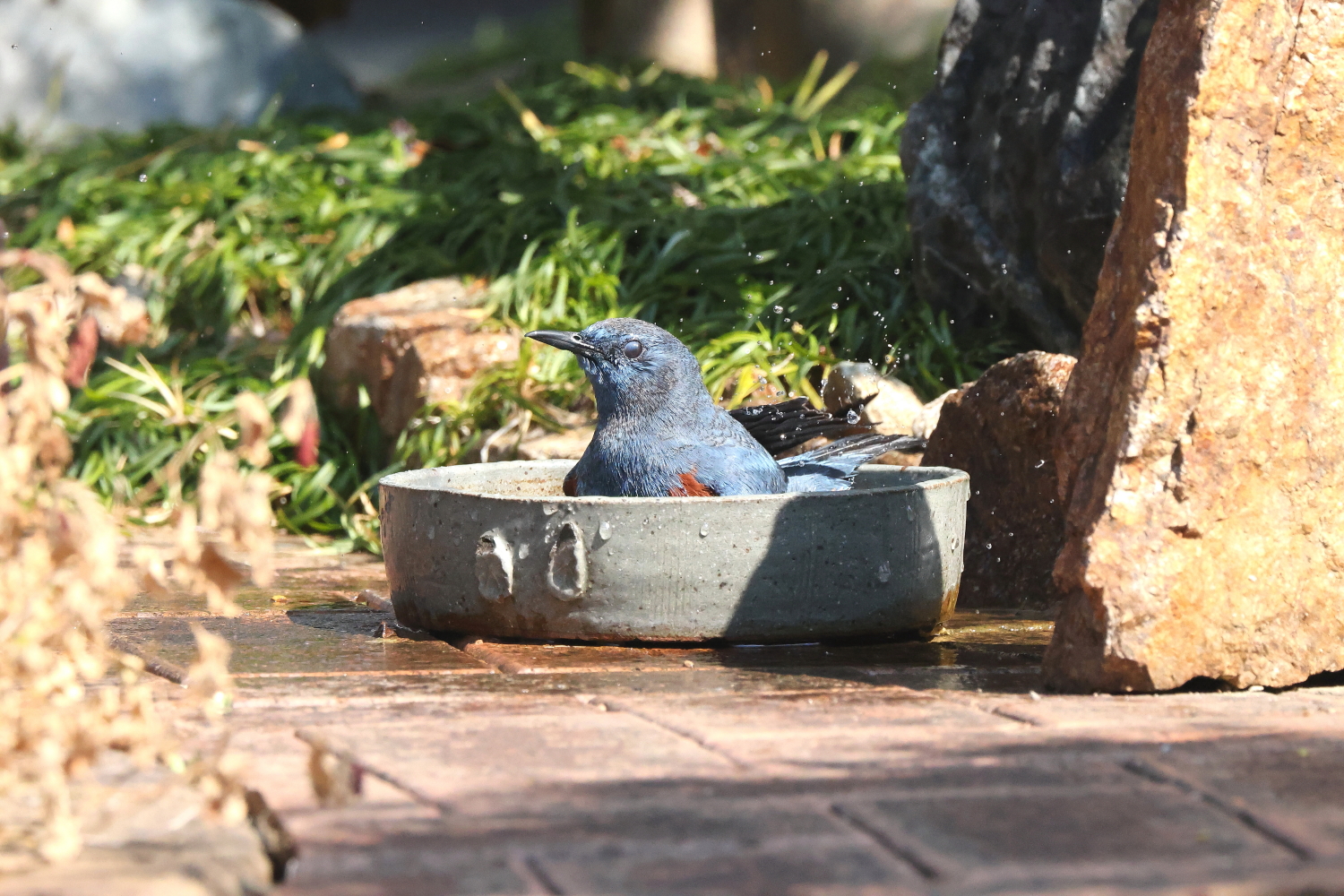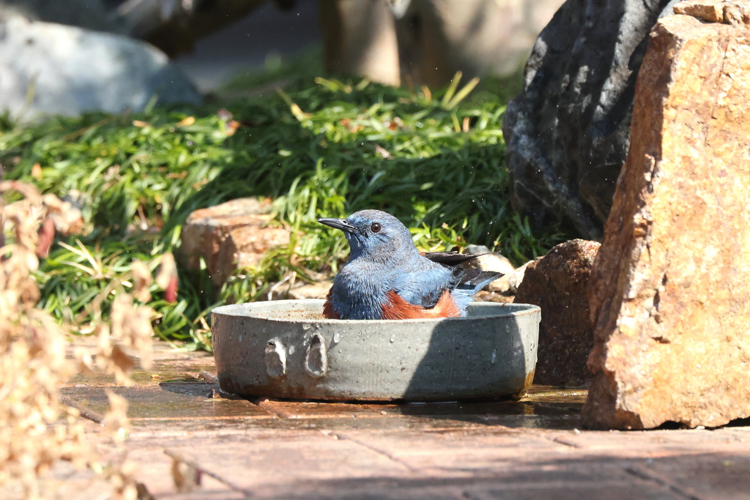 ☆お庭で気持ち良さそうに水浴びする「イソヒヨドリ♂」