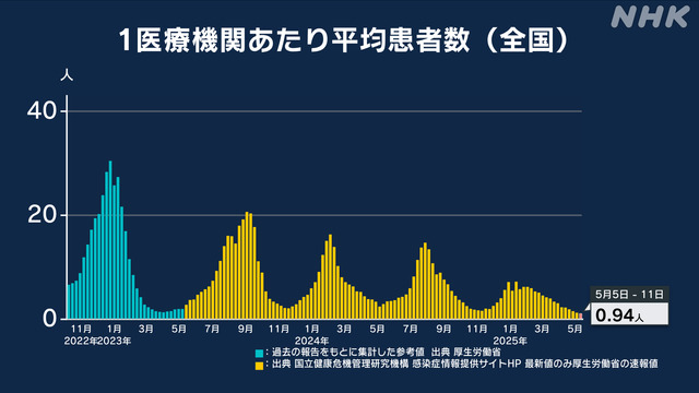 地元大阪府で、先週1週間(5月5日〜5月11日)に報告された新型コロナウイルスの定点医療機関あたりの患者数は、低水準で引続き低下傾向が継続しています。