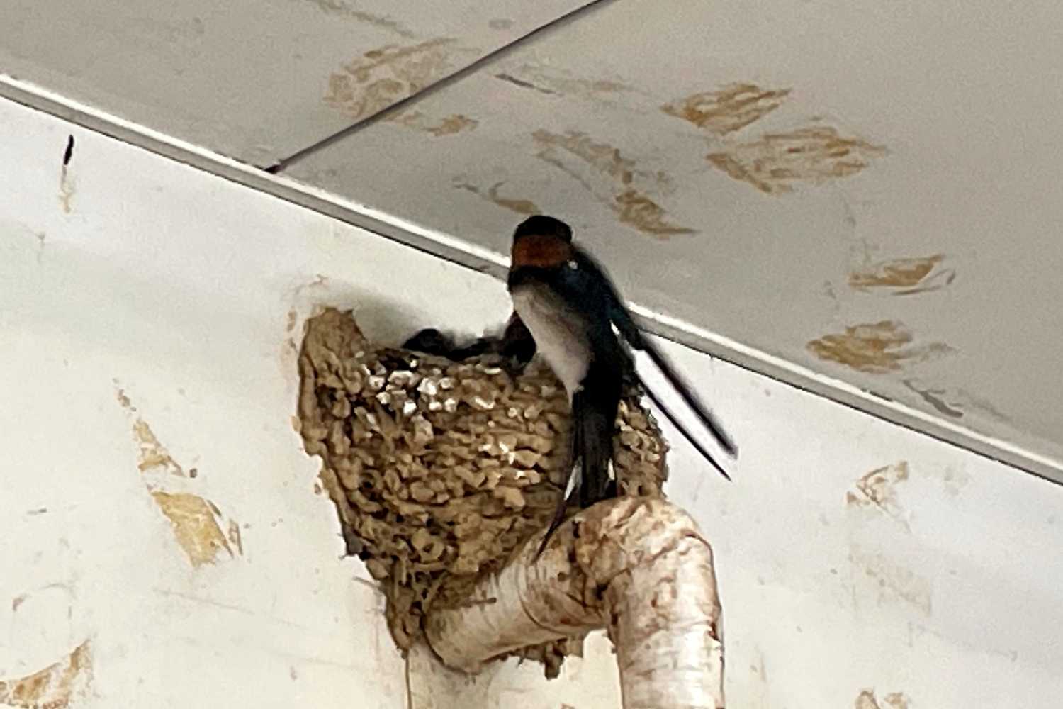 (本日更新2)谷瀬の吊り橋に挑戦していると、ツバメが何回も飛んでいるので、先を追ってみると、吊り橋の近くで「ツバメが営巣中」だったので、ふうさんがスマホで撮ってみました(^-^)