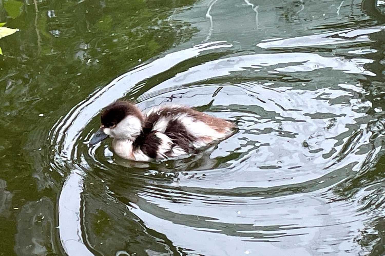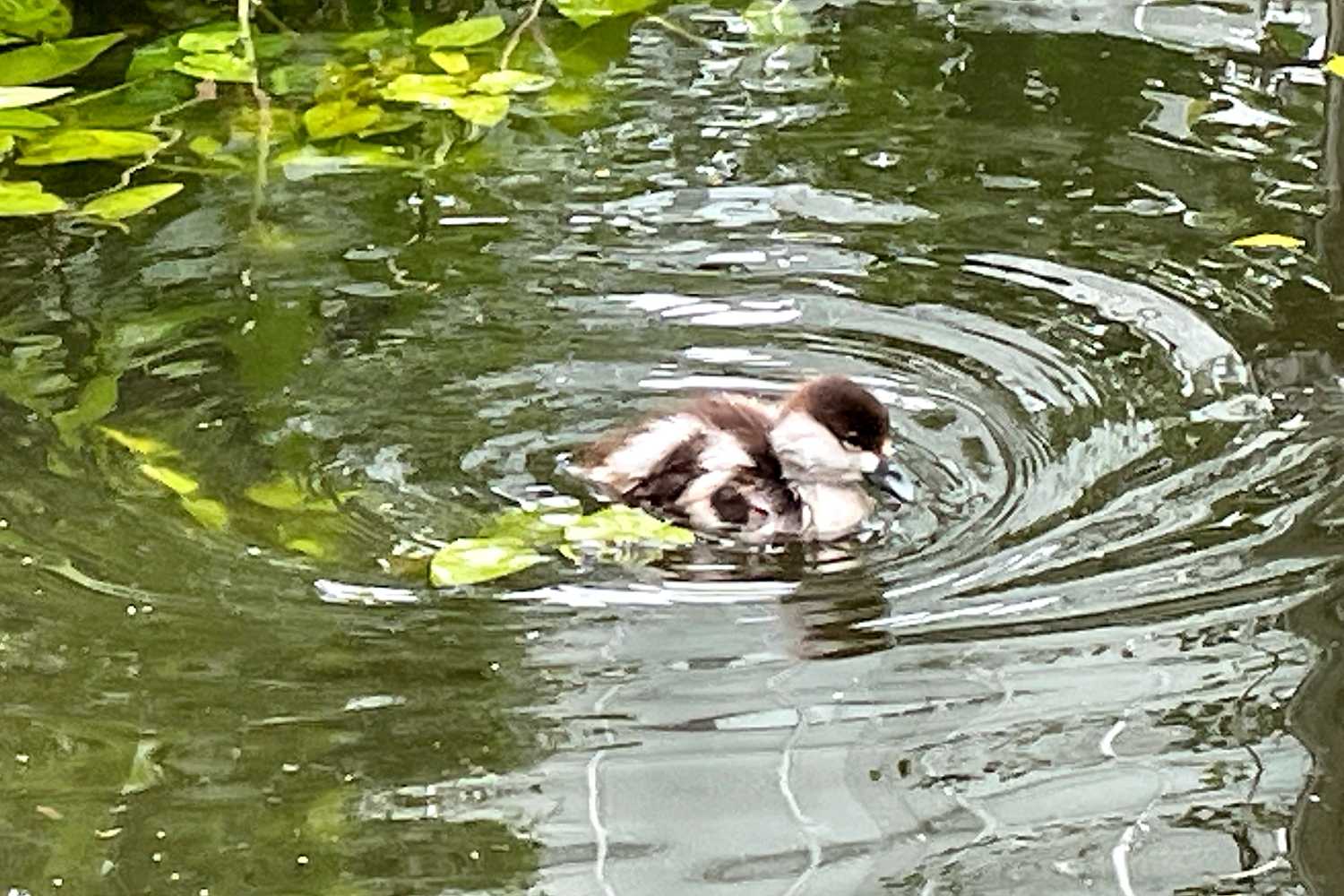 野鳥エリアで、珍鳥のアカツクシガモに雛鳥が誕生していて、悠々と泳ぎ回っていましたが、最後は疲れたのか、親鳥の横で休んでいました^^