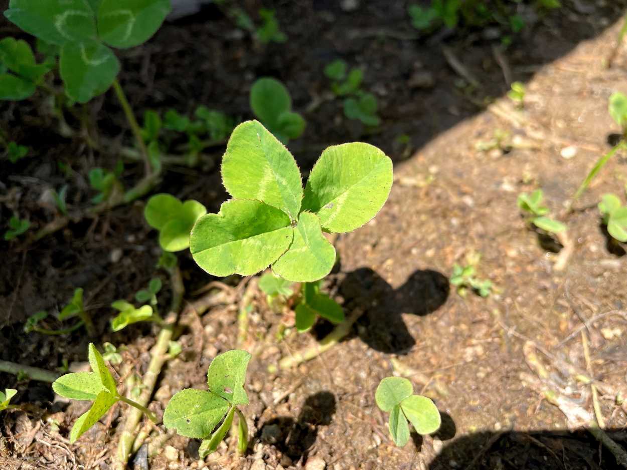 四つ葉のクローバーは、シロツメクサの茎のうち、小葉を4枚持つもので、通常みられる3枚の小葉の変異体です。