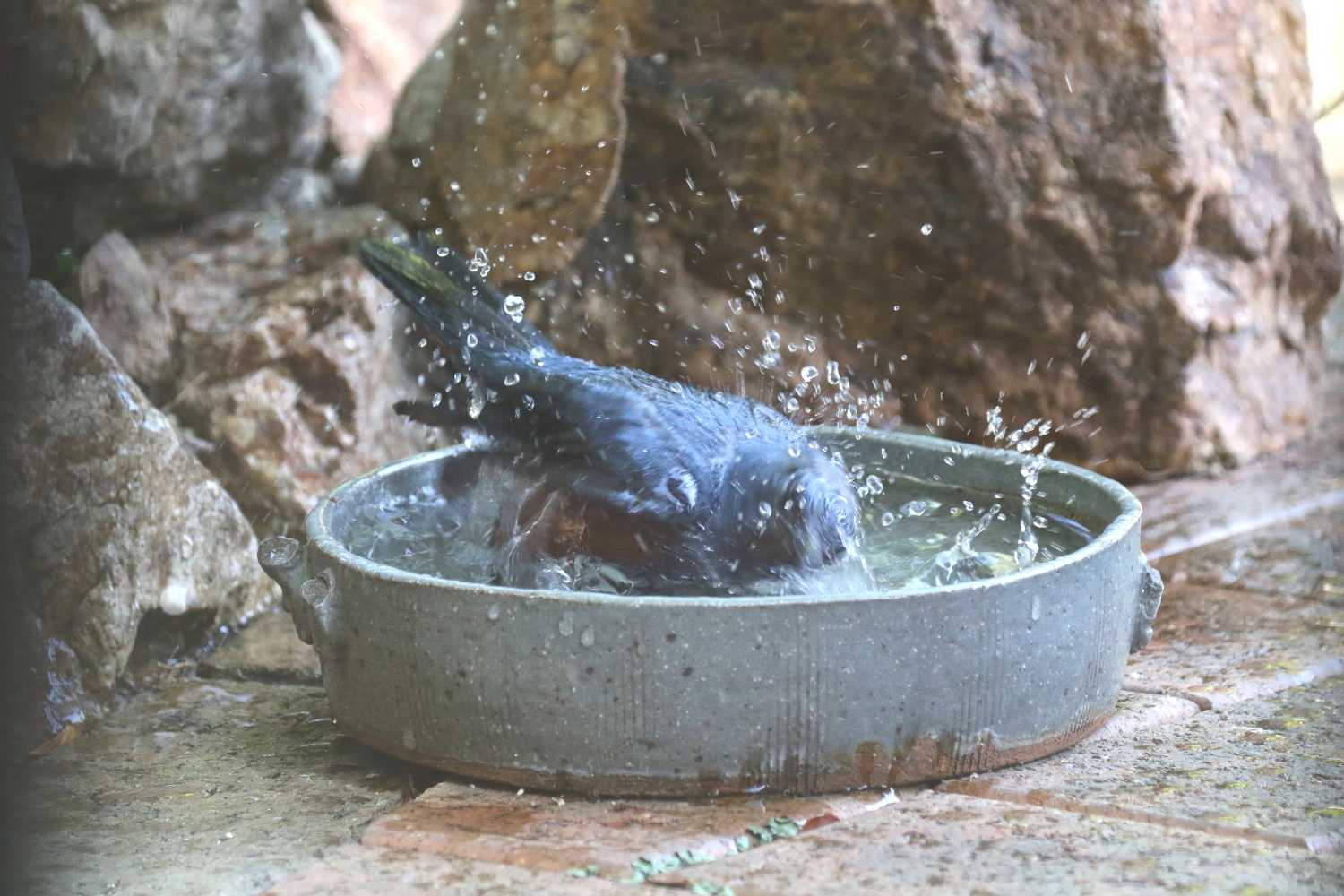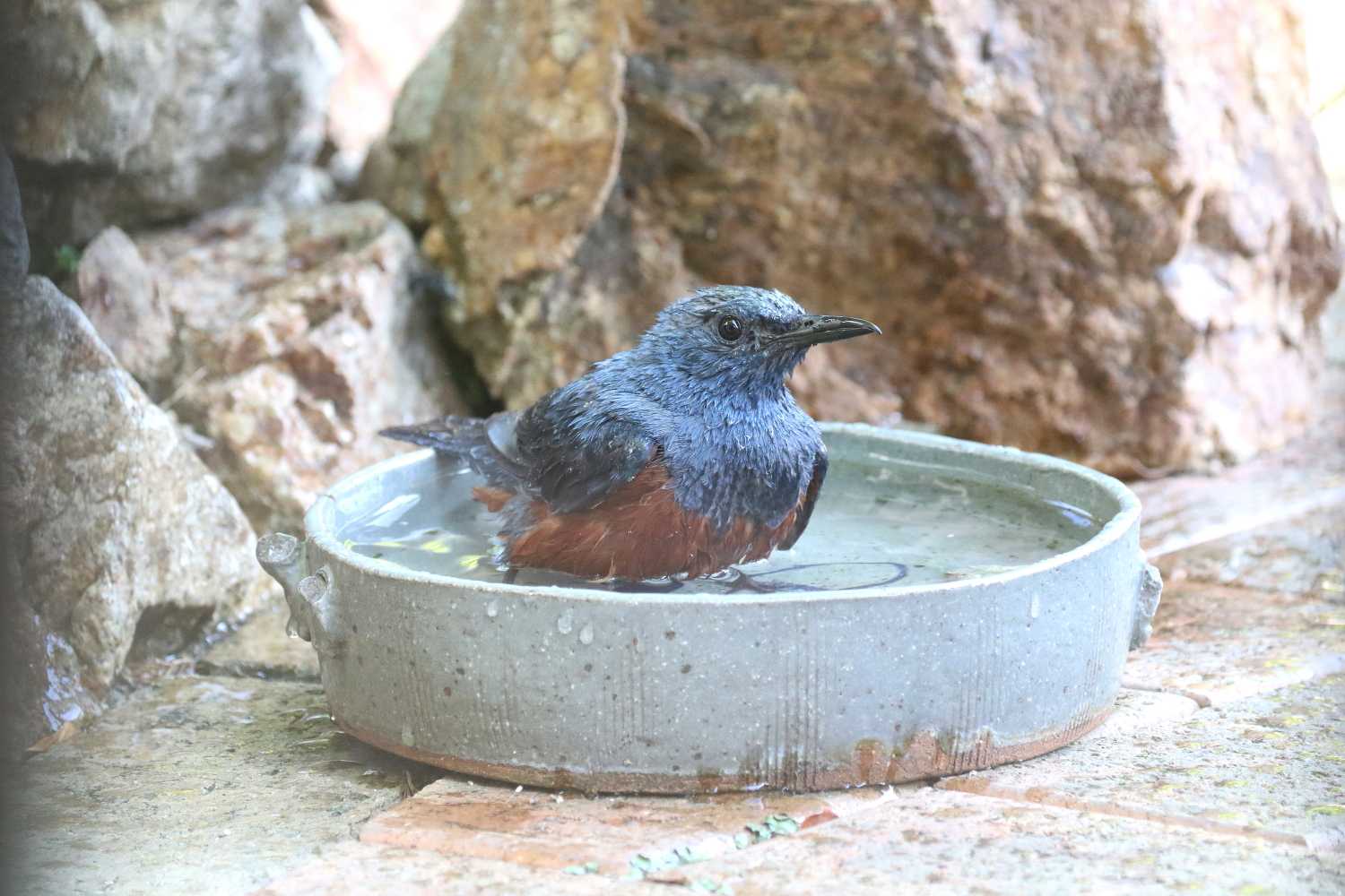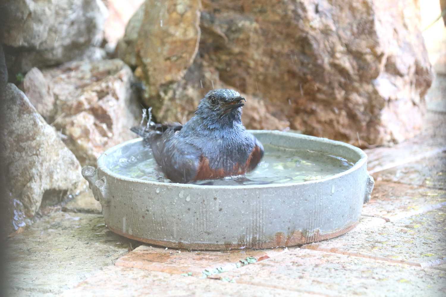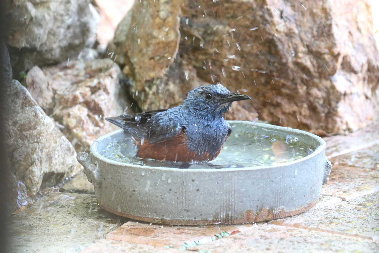 ☆お庭で子育てを終えてゆっくりと水浴びをする「イソヒヨドリ♂」