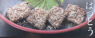 温泉から上がり、隣のレストランで「はっとう」を食べた。前夜同部屋だった人が美味しいと教えてくれたのだ。10割の蕎麦粉と餅米粉を半々にしてお湯で溶いて作った「ういろう」様の素材に、エゴマと砂糖、塩を混ぜたものが掛けてある。素朴な味わいだ。「はっとう」はあまりに美味しいためかつては「ご法度」(はっと)になったことからの命名らしい。