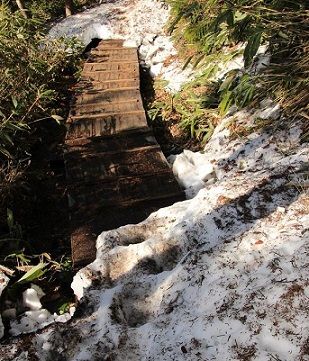 やがて沼山峠への登りが始まった。またしても雪道だ。慎重に一歩一歩足を進める。沢の近くでは、所々に雪を踏み抜いた跡が深い穴になっていた。峠の途中の展望台で小休止して水を飲む。出発して暫くすると、皆寡黙になった。足元が滑って不安定なのと、疲れが出て来たのだろう。