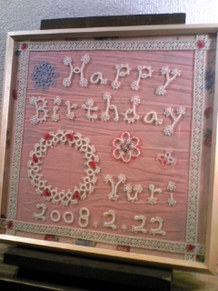 そんな母のレースと私のコラージュで、7年くらい前からウェルカムボードとバースデーボードを作っています。と言っても、作業の大半は母なのですが(汗)