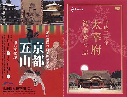 数年ぶりに正月の出勤がなく、マーもそろそろ夜更かしできるだろうという事で、マーが産まれてから初めて深夜の初詣。近くにも愛宕神社や住吉神社等があるが、どうせならば太宰府天満宮へ行こう。ちなみに、ここの三が日の予想参拝者数は200万人らしい。大晦日、17時半頃に入浴し、18時から夕食。鴨鍋を食べ、おかずがなくなったところで、昼に古式そば「土師」で買っておいたそばを投入。3人家族で4玉入れたのだが、マーがほとんど食べなかったので満腹に。食べ終わったところで、深夜に備えてマーと2時間ほど昼(?)寝。22時に自宅を出発し、車で天神へ。思ったよりも人が多くない。¥100/1時間(22時~8時)の駐車場に車を置き、西鉄福岡(天神)駅へ。メインの中央口ではなく南口の窓口で、太宰府駅までの往復乗車券である「太宰府初詣乗車券」を購入。少し立派な台紙に、2枚の乗車券(どちらを先に使っても可)が入っている。太宰府初詣乗車券22:35にホームへ上がると、22:40発の普通列車が停まっていたが、これは途中で急行に抜かれるのでパスして22:45発の急行列車に乗車。普通列車はクロスシートなのに急行はロングシートだったので、向こうに乗りたかった。次の薬院駅の方がコインパーキングの位置が近かったのだが、座りたいので始発駅である天神まで来たのだが、そんな心配は無用。立っている人はいなかった。まだ早かったのか、車で行く人が多いのか。ただ、西鉄二日市で乗り換えた太宰府行きの電車は人が多めで座れない人も多かった。天神を出てちょうど30分後の23:25、太宰府駅着。参道に出ても、思った程は込んでいない。このペースなら、えらく早く着いてしまうのでは?途中のお店での時間調整さえ考えたが、5分程歩くと、参拝待ちの行列とそれを制御している警備員の姿。日が明ける12時過ぎまではこの行列は動かないだろうと叫んでいる。そりゃあそうだろう。あと40分間も待つのか。それもその40分後は、参拝できる時刻ではなく、行列が動き出す時刻…。実際には10分に1回のペースで数m程前進。待っている間は、正面にある大型モニターにイベント情報などが流れるのを見て過ごす。はじめは暇つぶしになっていたが、同じ物が何度も流れるので、その内に飽きてしまう。その映像も、年明けの直前にはパッタリとやむ。カウントダウンの映像でも流れるのかと思っていたが何もなし。自分の腕時計でカウントダウン(こういう時は日付も変わるデジタルの方が面白いと思う)。ところが、みんなの時計が正確なわけではないので「明けましておめでとう」が時間差攻撃で聞こえてくる(自分の時計は電波時計なので正確)。 西鉄福岡(天神駅)と乗った電車の様子 左の赤い光がモニター 振り返ってみると… こちらは前方の様子年が明けてしばらくしてからやっと行列が動き出す。しかし、相変わらず、進んでは止まるの繰り返し(警備員が調整している)。 池の向こう側(帰路)には出店も 太鼓橋を超えますその内に雪も降り出してきて、楼門をくぐる時には結構な量に。ここをくぐっても、本殿まではまだ行列。やっと本殿に近付いても人が多くて、マーがなかなかお賽銭を投げられず、結局最前列まで行く事に。参拝を済ますと、マーのバレエの友達Mちゃんの、中学受験を控えたお兄ちゃんとマーに太宰府特製(?)鉛筆を購入。 やっと楼門まで到達 楼門をくぐっても本殿まではまだまだ売店の様子 鉛筆 お守りもたくさん売っている帰りは、出店が出たお祭りムードの境内を通って参道に出て駅へ。梅ヶ枝餅でも食べたかったが、マーは餅を食べず、カミさんもその気がなさそうだったので何も買わずに電車へ。往復切符で来たので、帰りの切符を買う為の行列に並ばずに済む。太宰府1:00発の電車に乗る。今度は天神への直通なので、二日市で乗り換える必要がない。但し、普通列車。ついでに櫛田神社や愛宕神社辺りに回ってもと思っていたが、もうマーが眠そうなので、天神から直帰。