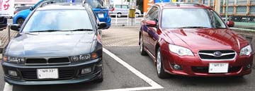 カミさんと一緒に、スバルへ「レガシィ」を迎えに行った。契約して約1ヶ月後のご対面。「あ、あれや」。珍しい色(ワインレッド)なのですぐにわかった。隣が空いていたので、そこに引き渡す「レグナム」を駐車し、2台並んだところを撮影。レグナム レガシィなかなか良い色じゃん。ただ「レグナム」の方が、精悍だな。最後の手続きの為に自分が店内に向かい、その間にカミさんが「レグナム」に積んでいた荷物を「レガシィ」に移動。それが終わったカミさんも店内に来てお支払い。全部済んでみんなで「レガシィ」に移動し、簡単に説明を受ける。ガソリンを入れて帰宅。1時間後に、マーを送って天神に行く必要があるので、その間に「レグナム」から積み替えた荷物の整理やレーダーの取り付け。出発時刻になって車へ来たマーの反応は、あまりにも薄かった。女の子ってそんなものかな。マーを塾の前で降ろし、普段ならば車を駐車場に置いて天神をウロウロするのだが、今日はこのまま乗り続ける。上り坂を走ってみたかったので、桜坂を上った。勾配が足りなかったかと思う程すんなりと上がった。平地での加速もブレーキ性能も満足。操作に関してはまだ不慣れな為、せっかくハンドルにパドルシフトがあるのに普通のシフトノブでギアチェンジしようとしたり、エアコンや窓の操作に手間取ったり。でも、とても楽しかった。徹夜勤務明けで午前11時半過ぎまで寝ていたから、一晩中でも走れたかも。今日は込んでいる道ばかりだったので、明日は高速でも走りに行こうかな。--追記--レグナムの中に度付きサングラスを忘れてきた。