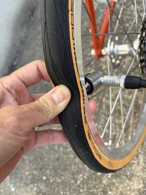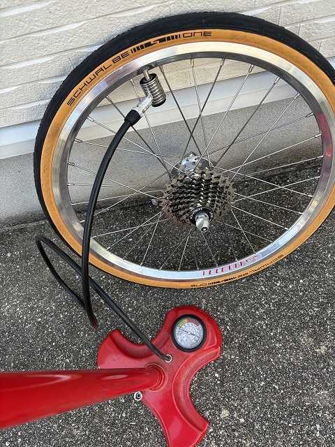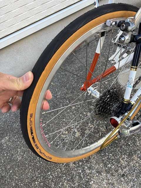お!午前中は曇りだったけど晴れてきました!っていうか午前中は寝てたけど。笑組み上がったホイールにタイヤを履かせていよいよBRUNOに組み込みます。新ホイールなのでチェーンとスプロケットも今日中にきれいにしたいところです。サンエクシードのラージフランジハブ!ベロシティのポリッシュリム!まぶしいですねー!いやー!嬉しい!明日で夏季休暇は終わりなので見とれていないで作業を進めます。まずはリムテープ!SCHWALBE(シュワルベ) 【正規品】ハイプレッシャーリムテープ 20(406)インチ用 2本入り 18mm幅 ライトブルー SW-JNU201805Wこれまでと同じシュワルベにしました。バルブ穴にドライバーで位置決めをしてぐるっとパッチン!新しいことは素晴らしいことだ!新しいリムテープは新しい肌着みたいな気分です。だいぶ変ですよね。笑続いてチューブ!●SCHWALBE(シュワルベ) チューブ 6SV(SV6) SW-10413313 仏式 サイズ:20x1.10~1.50(ETRTO:406) 箱入り 2本セット 【TQBC】これまた今まで通りシュワルベです!そしてタイヤはこれ!これまたシュワルベの「シュワルベ・ワン」!しかもこのタンカラー!サイズはETRTO28-406で20×1.1020インチの「クラシックスキン/タンウォール」はAliExpressとか海外サイトにしかなく国内ではショップでもAmazonでも売ってなくてYahoo! フリマに出てたのを見つけたけど買いたい時には出てなくて粘り強く次の出品が出るのを待って入手しました。見つけてから2年くらいかかったと思います。それではシュワルベワンタンカラー装着です!タイヤのトレッドの向きがあるので要注意。おっと、空気を少し入れないと。汗ビードを噛んでいないか念入りに確認。タイヤを触った感じは意外としっとり柔らかくて分厚いです。空気を充填してフロントはタイヤ装着完了!続いてリアも同様にタイヤを履かせます。いやー!カッコいい!このカラー!このロゴにしびれますよ!でも見とれてないで作業続行します!つづく