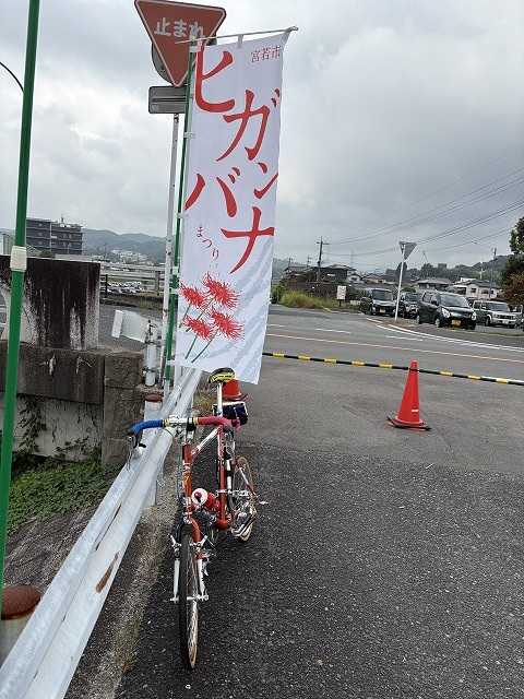 10:00 犬鳴川河川公園よかった!「ヒガンバナまつり」の幟が出てます!去年、彼岸花狙いで犬鳴川に来た時にはシーズンが終わってて刈り取られてたので今年は毎日情報をチェックしました。今年は咲くのが遅いので休みと合うかとヒヤヒヤしましたよ。笑ではさっそく河川敷へ!おー!咲いてます!よかったー!天気がイマイチだけど見事に一面の彼岸花!!しかも貸し切り!上の遊歩道にBRUNOを停めて下から記念撮影!貸し切りなので撮り放題!笑右も左も彼岸花!ずーっと向こうまで曼珠沙華!同じか!笑だけどせっかくの貸し切り花畑なのにやっぱり暗いなー!惜しい。でもまあ、さすが彼岸花の名所!どこまでも続く彼岸花を見れて満足しました。それでは今日のサイクリングは彼岸花リベンジからの初めての福智町、そして田川、飯塚と筑豊をぐるっと周って来ます!じゃ、福智町サイクリングスタートです!おっとっと!チラッと晴れてきた!雲の流れ的に貴重なチャンス!急げ!戻れ!もうすぐ太陽が顔を覗かせる!よし!晴れた!今のうち!はい!正面!はい!奥行き!はい!接写!よかったー!ちょっとでも晴れて!あっという間にまた曇りましたよ。笑今日はもともと曇りの予報であまり期待してなかったので一瞬でも晴れてくれてとても嬉しいです。それにしても彼岸花って素晴らしい姿ですよねー。お浄土っぽいというか。それでは改めて彼岸花リベンジに大満足したので福智町サイクリングに出発です!ちなみに車は河川敷公園の駐車場に停めました。シーズン中の週末は混んでるかもですね。まずは直方駅に向かいます。同じ犬鳴川でもこちら側は草刈り済み。去年はこんな感じでしたねー。草を刈った匂いがまた懐かしいです。犬鳴川から離れて東へ。10:33 JR勝野駅お、ここは前にも来た勝野駅。これでまた道がつながりましたね。駅の東側に出たいのでロータリーの向こう側へぐるっとぐるぐるぐるぐるー!あれ?一周したぞ!笑そっか!ここ向こうに渡れないんだった!笑せっかく日記をつけても学習能力がないという。汗お!面白そうな橋を発見!勝野駅の向こう側を覗くと遠賀川にかかる人道橋を見つけました。柵がないのは沈下橋ってことなのかな?予定のルートと違うけどこれは行ってみるしかないでしょう!せま!こわ!汗離合しませんように!あー面白かった!しかもこの細道を抜けると遠賀川サイクリングロードに合流!これはナイス!このまま直方までビューンと行ってみますか!つづく