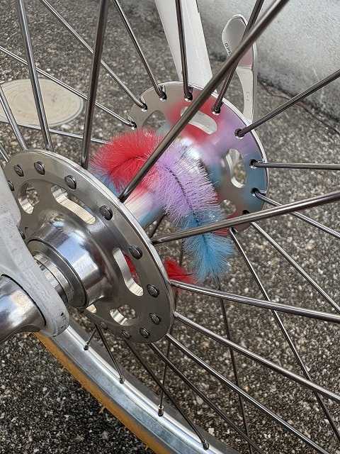 ホイールが完成したのでいよいよBRUNOに組み込んでいきます!もう完成かー、終わりたくない気もします。笑まずはチェーンの洗浄。このAZのチェーンクリーナー、安いけど、全然汚れは落ちません。汗なのでキッチンに持ち込み食器洗い洗剤でやり直しました。ママには内緒です。笑続いてスプロケットを取り外し。こちらも同じく内緒の場所できれいになりました。笑次はクランク!久しぶりにコッタレス抜きの登場です。クランクを外すとBBはこんな感じ。TOKENのスクエアテーパーBBとてもキレイです。それではクランクも内緒のキッチンで洗浄!笑なんだかんだ食器洗い洗剤が最強ですよ。スギノ・マイティビクトリー!やっぱりカッコいいわー!5ピンのガタもなく裏面もピカピカになりました!前後ディレイラーをパーツクリーナーで掃除してドライブトレインがキレイになったところでホイール装着の前にフレームにワックスをかけます。三ヶ島ペダル・シュプリーム!こちらもキラキラです!フレームを自家塗装してから3年ちょい。ぶつけてハゲてるところもあるけど思ってたより耐久性があります。 サンツアーのアウターストッパーに日泉ケーブルとジャグワイヤのキャップ。向こうはマイクロシフトのシフトレバー。最後のシマノ製品だった前後ハブが今回、新しくサンエクシードになるのでスモールパーツも含めて完全に脱シマノ車です!おっと!グリスはシマノ製でした。笑ちなみにシマノは大好きです!キレイになったスプロケットにシュアラスターのチェーンルブを噴いて装着!リアホイールが完全体になりました。現行のSORAハブ、リリリリリーッと静かです。走っていたら本当に聞こえないくらい。対して新しいサンエクシードキリリリリー!っと少し主張気味。ラチェットにグリスを塗ったけど現行ホイールよりはちょい音は大きめ。ま、爆音じゃないからいいかな。クイックリリースは今までのタイオガ製をそのまま使用。今まで探した中でこれがやっぱり一番スマートです。メンテナンススタンドに載せにくいけど。笑サンエクシードのハブに付属のクイックリリースは重いので現行ホイールに付けて保管します。さあ!いよいよホイールを装着しました!タイヤの表面はこんな感じ。なんだかしっとりしてて柔らかそうです。センターもブレーキの当たりも大丈夫そう。リアホイール、オッケーです!フロントもオッケー!それではチェーンをつないで完成させます!そして現行ホイールは一旦予備にまわります。BRUNO純正ワインマンのリムにSORAハブと星スポークで初めて手組みしました。タイヤはコンチネンタルのコンタクトスピード。フリーがとても静かでキレイな姿のホイールです。初めての手組み、最後のシマノ製品、そしてリムは最後のBRUNO純正パーツでした。今まで色んな所に連れて行ってくれてありがとう!しばらくの間、お休みしててください!それではうちの前で試走!お!あ!乗り味が柔らかい!転がりはヌルッとスムーズ!今までのコンチネンタルはコツコツ硬かったけどこれは走りやすいかも!そしてちょっとフリーがキリリリリって鳴る!笑もっと乗りたいところだけど今日のところはこれで我慢。きちんとシェイクダウンのルートを考えて、後日、じっくりと味わいたいと思います!それにしてもカッコいい!!3年越しの理想のホイール、ついに完成です!3年越しだったかな?笑とにかく!夏季休暇中に夏休みの宿題が終わりました!片付けた後は、完成記念でランウェルのコーヒーで一服。違いがわかる男になれたかな?笑さあ!新ホイールでどこを走ろうかなー!