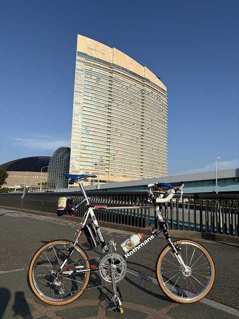 よし!ハブ毛でドレスアップ完了!これでBRUNOカスタムは完成です!それでは新しいホイールのお試しとシンBRUNO完成記念で百道浜まで行ってきます!まずは室見川に出て海に向かって北上。ここはホイールのシェイクダウンにピッタリだ!まずは自分で組んだ新しいホイールの確認。シュワルベ・ワンは予想以上に地面からの振動が柔らかく、以前のコンチネンタルの硬さとは違います。あとシールドベアリングのおかげか全体的にしっとりした感触です。そしてラジアルで組んだフロントとイタリアン2クロスで組んだリア。スポークの組み方の違いは正直分かりませんがとりあえずまだ空気は抜けてないので大丈夫そう!笑よーし!新しいホイールの感じは良好!ただ手組みなのでまだ踏み込むのは怖くて 全力では走っていません。あと、心配だったフリーのラチェット音は キリリリリーっとうるさくはないけど今までより少し大きめ。ま、慣れるかな。今のところ許容範囲です。室見川を北上して室見駅からは河川敷の遊歩道がなくなるので住宅街の中の見事な松並木を眺めて進みます。昔はこれが海岸線だったのかもですね。少し進むと人道橋がありました。地図で調べると「百道橋」橋の入り口がとてもかわいい造りです。百道橋で金屑川を渡って百道エリアへ。サイクリング向けのルートを見つけて嬉しいです。百道側に出てまた川沿いを北上。よかトピア通りの下をくぐります。ここから先はシーサイドももち海浜公園。あとは撮影場所を探します。ここは都市高速がダイナミックで好きな眺めです。室見川河口。向こう岸は愛宕浜のマリナタウン。夕陽の影になってて軍艦島みたいに見えます。百道浜!福岡タワーをバックにじっくり撮影出来そうな場所を探したいけどビーチバレーにマリゾンに海水浴にお客さんが多過ぎて中心地はパス。百道浜を越えてドーム方面へ。ここまで来るとあまり人がいないので好きに撮影しても恥ずかしくないです。笑福岡タワー!だけどちょっと遠いしこっち向きだと逆光か。ドーム側にすると夕陽がいい感じに反射してきれいだけど自分の影が入るなー。汗おっと、Zチームのボトル忘れてた。もったいなくて記念撮影くらいしか出番ないですからね。それでは記念撮影開始!車体全体と、部位毎のカット撮り。後でパーツの型式を調べてブログにアップします。面倒くさいけど楽しみだなー!2010年末に買ったBRUNOを2020年秋のコロナ禍にレストアをし始めてその後はカスタムにハマり2022年の夏には塗装までやり直しました。あれこれいじりながら丸5年がかりで遂に完成です!いやー!嬉しい!でも実はついに完成とか言いながらサドルとかブルホーンとかオフロードタイヤとかまだまだいじりたい事が山ほどあります。笑フレームと保管場所さえあればもう1台組める分のパーツもあるし。笑それでは撮りまくって気が済んだのでドームの外側から川沿いに南下して帰ります。ドームの隣の「E・ZO」にはいつか子どもたちを連れて来てみたいな。ついて来てくれるかな?笑今日は室見川、百道浜と走ってのんびり快適なサイクリングでした。これに西公園と大濠公園を加えたら素晴らしい散歩リングコースになりそうです。体力はつかんだろうけど。笑【本日のサイクリング】走行距離:16.9km獲得標高:41mよーし!まとめブログ書くぞー!(10月頃になるかなー笑)