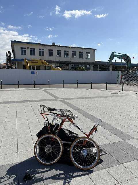 10:41 平成筑豊鉄道伊田線 嘉麻川橋梁歴史を感じる煉瓦の橋脚、今日は草で埋もれてます。まだまだ夏の名残って感じしますねー。こっちの橋は逆さクレーン車で作業中。まだまだ知らない働く車があります。さすがにこれはトミカには無さそう。笑とかとかのんびり快適に走りながら直方へ。もうすぐチューリップフェアをやっていた場所です。チューリップ畑は何やら工事してますね。向かいの河川敷ではステージを組み立て中。かなり大規模だけど何かのフェスとかかな?気になったので調べてみるとあっちのお役所側の河川敷「直方リバーサイドパーク」では今週末に「メイク ア モノガタリ」というイベントで遠賀川の花火大会と同時に湘南乃風とかTRFのライブが行われるそうです。それはすごそうだ!あ!もしかして「モノガタリ」って「モ直方リ」ってことかな?直方が物語の中心って意味かもですね。だから英語表記なのかー。とかとか感心しながら川を渡るとこっちは何かの新しい庁舎を建設中。直方市は元気がいいですねー!「日の出大橋」の西側にアートなフクロウの像!話は変わるけど大阪の「太陽の塔」はいつかサイクリングしてBRUNOと一緒に記念撮影したいと思っています。いつになるかなー!笑あ、それと塗装の補修でゴールドに塗ったライン思ったより目立たなくて安心しました。ま、自分しか見ないですけども。笑さて直方の市街地はすでに走っていますが今回は直方駅に寄ってみます。お!なんかカッコいい!待合所?ベンチ?案内を読むと100年以上前の直方駅駅舎の車寄せを当時の素材を使って忠実に再現したんだそうです。へー!それはそれは立派な駅だったんでしょうねー!こっちには直方発祥の「もち吉」のショップ。ん?「うどん」の幟もありますね!どゆこと?笑それはノーマークだったなー!さっきのもち吉のうどん、ちょっと悩んだけど今日は別の直方グルメに寄るので泣く泣くパス。新しくてシックな直方駅に向かいます。出た!お尻!笑11:00 JR直方駅 大関魁皇像立派ですねー!カッコいい!確か魁皇は同級生だったかな。キムタクと貴花田も一緒ですね。あと、ホリエモンとジダンも。笑団塊ジュニアの地元の星、魁皇関の像を見たあとは直方グルメでサイクリング飯とします。まだ10kmも走ってないけど。笑11:02 からあげ&カレー焼き 次元駅前通りの大きなお寺の隣、「カレー焼き」の「次元」にやって来ました。お、店先にサイクルラック発見!こういうのウェルカム感があって嬉しいですよね。前回、長崎街道サイクリングで直方に来た時は成金饅頭とチーズ饅頭に行ったけど その時からこの「カレー焼き」も気になってたんですよ。それではさっそくお店のベンチでいただきます!まずはクリームから!スティック型の生地に斜めに「直方」の文字!他県の人は「ちょくほう」って読みそうだ。笑お!!生地がもちもち!カスタードクリームはねっとり!甘過ぎなくてちょうど美味しい!予想外に洋風な仕上がりです!ちなみにこれは全然カレー味はしなかったけどメニューでは「カレー焼き クリーム」です。笑さて!本命のカレー!こっちは「直方」の文字が横。これで味の区別をしてるのかな。では!「カレー焼きのカレー焼き」いただきます!おおお!!いきなりカレーのスパイシーな香り!!カレーが美味い!ちゃんと辛い!そしてシャキシャキキャベツ!これが合う!からの後味はホットケーキ生地の洋風な甘さ!辛いと甘いのループであっという間に完食です!カレーパンともピザまんともピロシキとも違う懐かしいけど初めての美味しさ!唯一無二の直方グルメ、カレー焼きはまさにサイクリング飯でした。ツールド九州で使ってほしいですよね、カレー焼きとむっちゃん万十。笑おわ!今度は「焼きスパマン」!工事現場の壁に描いてありました。そうなんですよ、直方にはまだ「焼きスパ」なるグルメが残ってるんですよ。帰ったらまた直方ルートを考えなくては!笑さっき渡った橋を戻って遠賀川を渡ります。チューリップフェア会場跡地から彦山川沿いに今度は南下します。このオートキャンプ場は気持ちよさそうですね!彦山川沿いに南下して今日のメインとなる福智町へ。川沿いにサイクリングロードが続いているけどここから先は草がすごすぎてギブアップ。汗河川敷から車道に上がりました。少し進むとサイクリングロードは未舗装になっていました。さて!そろそろ福智町に入ります!つづく