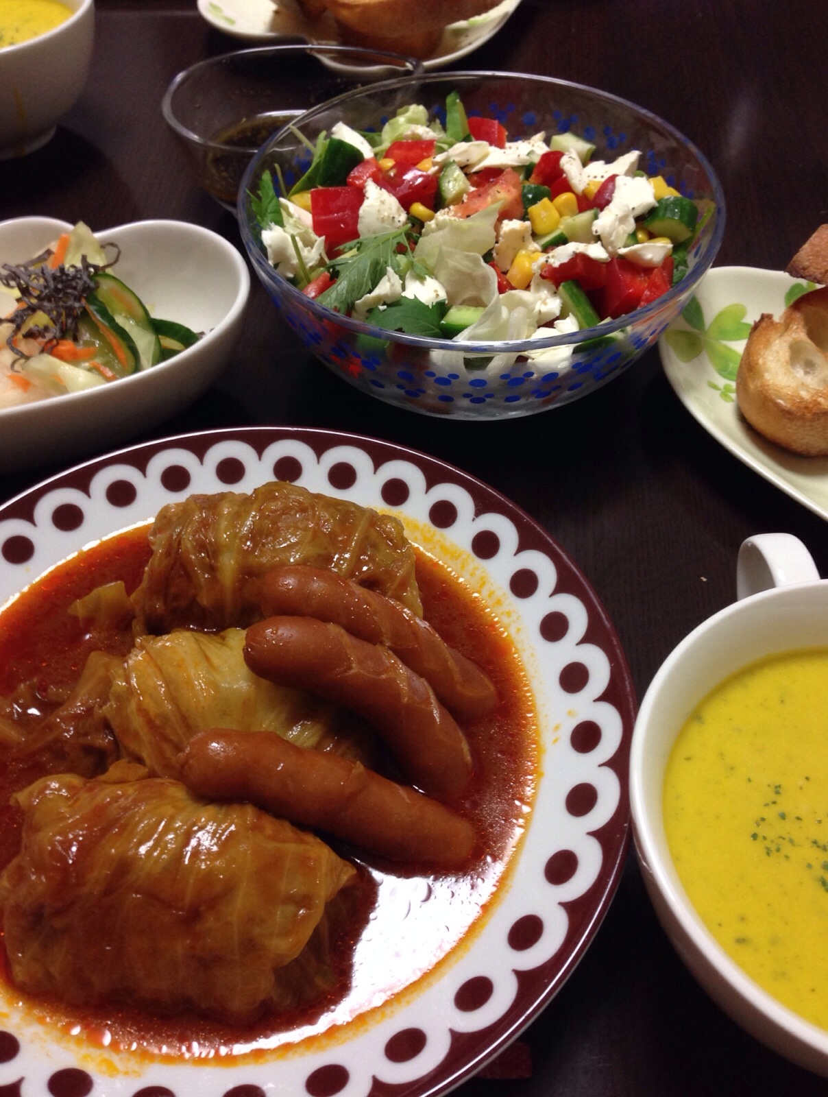 こんばんわ〜ー!天気悪いですねぇ。台風11号が日本列島に近づいてきてます。四国の大雨が心配ですね…。さてさて、本日の晩御飯。結婚2年目の新米主婦なので、まだまだ作ったことのない料理がたくさんたくさんあります。本日のメニュー●ロールキャベツ●冷製パンプキンスープ●クリチ入りのサラダ●バゲット●野菜の浅漬け ロールキャベツはいつもコンソメ味で食べる時にケチャップつけてましたが、今回初めてトマト味のロールキャベツに挑戦!トマト缶だと調味料で調整しても酸味が強く残りやすいので、今回はトマトジュース×圧力鍋で挑戦!いつもそのままロールキャベツの表面は焼かずに圧力鍋で煮込んでたのですが今回は圧力鍋で煮込む前にバターでロールキャベツの表面をちゃんと焼き付けてから煮込んでみました。やっぱり焼かないのと焼くのとは味が違うようです!絶品でした!!!トマトジュースの他にウスターソースやケチャップ、はちみつ、オイスターソース、お酒を入れてます!さらに圧力鍋で15分炊きました。トロトロでした♡ただ、失敗だったのはウィンナー。ウィンナーの旨味も必要かと思って一緒に圧力鍋で炊いてみたら、柔らかくなりすぎてました汗これ、反省です。そしてパンプキンスープ。これは今回初めて作ってみたんです。というのはハンディブレンダーを最近購入したからスープ作ってみたくて♡♡♡最近購入したのはティファールのハンディブレンダー!もうすぐ新しい型番が発売されるらしく、(もう発売された?)その前の値引きだそうです。★8/6am9:59迄ポイント3倍★8/6am0:59迄Facebookポイント5倍★【Joshinは平成20/22/24年度製品...価格:8,930円(税込、送料込)ほかにもブラウンやバーミックスなど他に大手有名メーカーがありますが私はキッチンに立てて置いておけて、アタッチメントもゴチャゴチャしないのが欲しかったのです♡フープロはたくさん使いたい時に出す感じです(^O^)このブレンダー最高です!おかげでジュース作るのに毎日フル回転してます。粗めになりますが氷も砕けるので夏は大活躍!と、話はそれました。パンプキンスープはじっくり玉ねぎをバターで炒めてかぼちゃと水とコンソメ入れて煮込んで、少し牛乳入れてブレンダーの出番!初めてお鍋の中でブレンダー使いました!ただ、お鍋もティファールちゃん使ってますが鍋底が傷つかないかビクビクしました(笑)音が怖くて怖くて(笑)残りの牛乳と生クリーム入れて再度ビクビクしながらブレンダーにかけて……一煮立ちさせて冷ましてから、他の容器に移して…ブレンダーを使った鍋底を見ました。鍋は無事だったようです(-。-;鍋底を傷つけてそうな音出すから本当怖かった…ちなみに使ってるお鍋ちゃん♡重ねて収納できて便利な9点セット!IH対応ではありませんティファール インジニオネオサファイ...価格:13,824円(税込、送料込)あれ?よう見たら若干ちがう。。蓋がスマートになってる?我が家の蓋はつまみが磁石でくっつくタイプ。新しい方がスマートでいちいちつまみをつけなくていいから楽やん!!!結婚祝いでもらったから仕方ないか…。あ、パンプキンスープは初めてにしてはなかなか上手にできました!あとサラダはベビーリーフにレタス、クリームチーズ、パプリカやトマト、コーンなど入れてバルサミコ酢のドレッシングで♡あとはバゲットで♪ザ 洋食 ? 洋食やけどフレンチなのかイタリアンなのか(笑)野菜の浅漬けもあるからミックスですね(笑)ただただ、本日は上手く出来たのでよしよし!