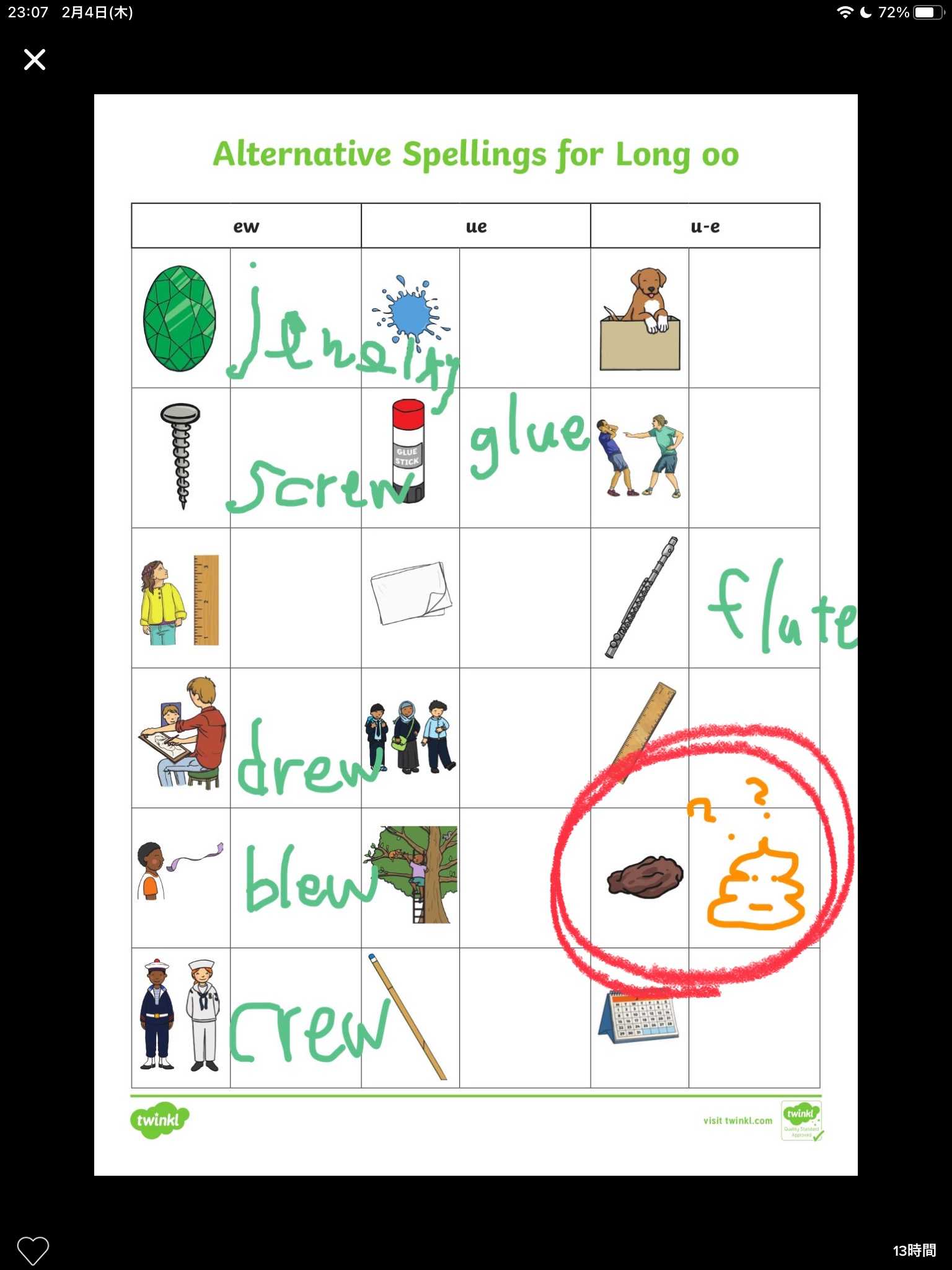 娘のホームラーニングで単語スペルの問題があった。絵と発音文字を見て考える。一つ、どうしてもアレにしかみえない絵があった。でもその単語は上記にあるスペルを使わねばならない。娘も私も分からないからイラストを描いて提出した。。(^◇^;)あの赤く囲んだところの絵、アレにしか見えないでしょ。笑先生から返事が来た。さて、答えは何だったでしょう。答えは。。。。プルーン!!!分からんって!笑そんな今日のお勉強でした。明日明後日はお休み。ゆっくり寝よう。ではまた明日ーーー!!【 使う前には戻れない 】Skull & Co. 正規販売店 Switch GripCover スイッチ カバー スイッチ ケース Switch カバー Switch ケース グリップカバー楽天で購入にほんブログ村