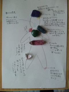 昨日ほどではないけれど、今日も真冬日。そんな寒い中、ワークに参加してくださって、ホントにありがとう~結構、面白かったね~やろうと思ってたことがどんどん変わっていくんだもん。ライブの楽しみ?まずは、高次とつながる瞑想。そして、自分の身体について、メッセージを受け取ります。先に人型を書いておいた紙に、色をぬったり絵を書いたり、受け取ったメッセージを書いたり。頭部、右腕、左腕、上半身、右脚、左脚と次々スキャンしていきます~いや、みんな、受けとるの速いから~淀みなくすらすら瞑想しつつ、メモや絵を書いていきます。瞑想が終わったあとには、それぞれの箇所、メッセージがわかりにくいところはカードを引いて補っていきます。う~~~む、わたしは、また与えると受け取るのバランスがいっぱいでた。TCカラーセラピーでも出たんだよね~これは次回オーラブまでの課題ですな。あと、天からの贈り物をたくさん受け取りましょう~とか、許しなさいというのも。そのあと、直感で石のタンブルを必要だと思うところに置いていきます。こんな感じ。しばし、お茶をしながら、ヒーリングタイム(笑)まぁ、色々話題炸裂です(笑)食べて、飲んで、しゃべって・・・の後は、直感的に置いた石の意味を調べました。不思議にね~ぴったりの石を置いてるのよね~あっという間の三時間。2月は27日にもやろうかなぁ~と思ってます。またたくさん、おしゃべりしましょうね!