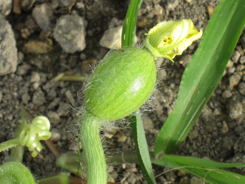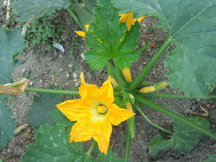 植え付けから3週間。大輪の花が咲きました。でも、雌花だけで雄花が咲いていない。残念。