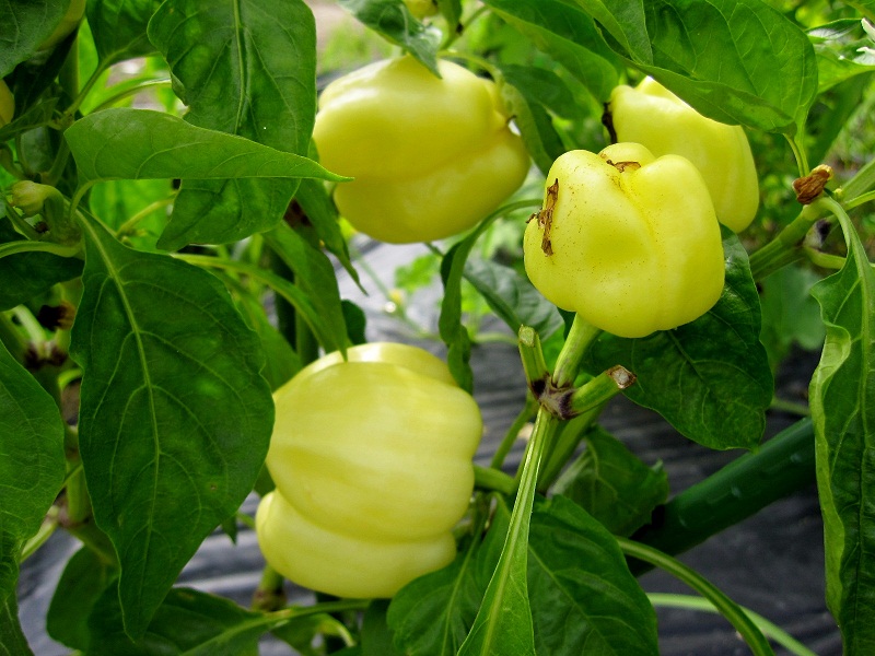 きゅうり2なす1オクラ1ミニトマト3 最近、ミニトマトが小粒になってきました。これは間違いなく、肥料不足。追肥しなくちゃ。UM77さんのリクエストによりほんじつの写真はカラーピーマンです。味のほうはまだ試していないのでわかりませんが、白や紫のピーマンがなっているところは不思議な光景ですよ!