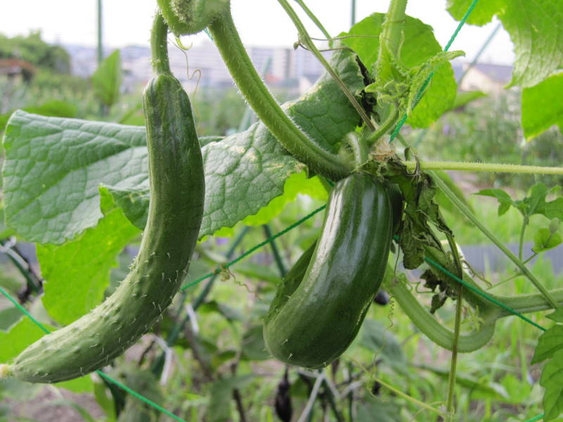最近仕事が忙しくて、畑に4日間ほどいけなかったら、きゅうりがまたまたお化けになっていました。 ナスは今まで取れた中で一番いい形と大きさ。 オクラもそろそろ取れ頃です。 庭で育てている黒豆もそろそろ本葉がそろってきて、徒長気味の苗もでてきました。今週末には畑を整備してうえつけなくちゃ。きゅうり 9ナス 2オクラ 1