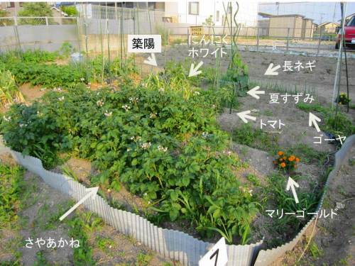 さて、昨年から始めた家庭菜園。今年は2クール目。今年は土作りから始めなくてもよかったのでとっても楽チンでした。・じゃがいも 2011年は 3/26 植え付け 4/18 萌芽 6/ 1 開花 6/23 収穫開始 6/27 撤収 でした。今年は 4/8には萌芽が確認できているので、種類もちがいますが、6月中旬にはジャガイモ収穫が開始できそう。 ちなみに今年の品種はさきあかね。 楽しみです。 にんにくもそろそろ収穫が近いか。