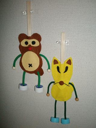 昨日は、保育技術者研修会、 【棒人形「きつねとたぬき」を作ってあそびましょう】に参加しました。 割り箸に、芯にする台紙を貼ります。 その上から、きつねとたぬきに切り抜いたフェルトを張ります。 材料が個々に配られていて、フェルトを貼ったら、芯の方がフェルトより大きくて・・・ 貼ってから、はみ出した部分を切り落とすのにひと仕事 !! 短時間で仕上げないといけないので、同じグループになった人たちは、皆どんどん作業が進んで行くので、私は焦ってしまいました。 割り箸を持って、「わらべ歌」を歌いながら、人形を動かします。 きつね ♪ ひとやまこえて、ふたやまこえて みやまのたぬきさん たんたんたぬきさん あそぼじゃないか ♪ たぬき ♪ いまはごはんの まっさいちゅー ♪ きつね ♪ おかずはなーに ? ♪ たぬき ♪ うめぼしこーこ ♪ きつね ♪ ひときれちょーだい ♪ たぬき ♪ いやいやしんぼ ! ♪ 人形はそれぞれが、皆表情が違っていて、とても可愛らしくて、座らせたり、歩かせたり・・・ 一寸動かすだけで、きつねとたぬきの表情が変化して、引き付けられてしまいました。 みんなでニコニコ顔で歌い、楽しい講習会でした。