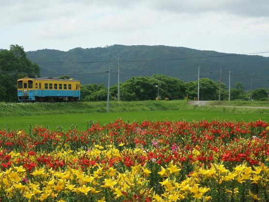 由利高原鉄道(由利本荘市)の線路脇に近いユリ畑。 150品種のうちのオレンジの「ミレーラ」 赤色の「グランパラディソ」 黄色の「ソレミオ」「コネチカットキング」 が、今見ごろで、色鮮やかに咲いている。 「こんなに沢山の、鮮やかな色の「ユリ」を見たのは初めて !! 」