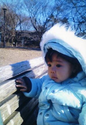 初孫のみ~こは今日で1才です。 (おめでとうパチパチパチ) (この前、み~こママがメールしてくれました。) 「近所の公園で鳩ポッポさんを見ているところデース」 み~こは先日、ウイルス性の下痢をして大変だったようですが、 今はもう、すっかり元気になって、毎日、 家中を、くりくり目で真剣に調査して忙しいそうです。 私達は、年末に義姉のお見舞いに、東京の病院へ行きました。 その時以来、み~こに会っていないので・・・またそろそろ・・・ 『み~こパワー』のシャワーを浴びたいです。