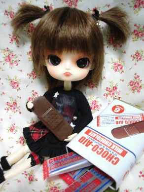 ダータの表情を見ると、どこが「ハッピー・バレンタイン!!」なんだよという感じがします(苦笑)きっと、テヤンにチョコを渡そうと思ったら、プーリップに先を越されて、機嫌が悪いんだと思います。ダータがもっているチョコは、ソニプラで見つけた絆創膏の形をしているビターチョコです。形が面白いので思わず買ってしまいました!!ダータが着ているお洋服は、この前のアイドールで買ったブライス服です。可愛いのにリーズナブルなお値段でした。ブライス用なら、同じサイズのダルも着れるだろうと思い着せてみたら予想通り似合って可愛い!!(親バカ)