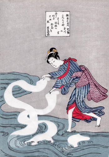 鈴木春信 調布の玉川 (江戸時代)作者未詳 相模国さがみのくにの歌多麻川たまがはに晒さらす手作りさらさらに 何なにそこの児このここだ愛かなしき万葉集 3373 多摩川に手織りの布をさらす。さらさらさらして、さらして、さらすようにさらにさらにこの娘がどうしてこんなに愛しいんだろう。── 俵万智訳(「新潮古典文学アルバム・万葉集」所収)註相模国さがみのくに:現・神奈川県のほぼ全域と東京都の南西の一部。多麻川たまがは:現表記はご存じの通り「多摩川」であるが、いずれも万葉仮名、ないし当て字であることは疑いなく、語源は「玉川、珠川」であろう。当時貴重な珠玉でも採れたのかも知れない。手作り:「調布」とも書く。下記解説参照。さらさらに:川の水が流れるさまを表わす擬音語(オノマトペ)「さらさら」と、副詞「更々」(なお一層、ますます)、および副詞「更に」(重ねて、今まで以上に)の3語が掛けられていると解される。万葉時代の表現としてはなかなかの機知・技巧といえるだろう。ここだ:「こんなに多く、こんなに甚だしく」を表わす上古語の副詞。数詞の「ここのつ(九)」と語源的関係があるともいわれる。愛かなし:「愛しい」「切ない」「悲しい・哀しい」など、強い情動を包含して表わした最重要の古語形容詞。現代語には、そのうちほぼ「悲しい・哀しい」の意味だけが残ったが、「愛しい」「切ない」などの含意も完全には消えていないように思う。「さらす」と「さらさら」、「このこ」と「ここだ」が韻を踏んでおり、言葉遊びの意図が感じられる。奈良時代、庶民は現物納付の税(みつぎもの)である「租・庸・調(そ・よう・ちょう)」を納めたが、相模の国・多摩川周辺の民衆は、そのうちの「調」として布を納めていた。地名「調布(ちょうふ)」の名の由来である。なお、こうした現物徴税の制度があった記録は「魏志倭人伝」の邪馬台国の記述にも見られる。租庸調を納める際には、今でいう「ご当地ソング」のような和歌(やまとうた)を添付する習わしがあったという。いってみれば、後世の熨斗(のし)袋における「熨斗鮑(のしあわび)」のようなものであろうか。また、これとは別に、各地の国府・政庁などからの政治経済に関する報告や「風土記(ふどき)」の編纂資料などとともに採録されたとも言われているが、詳らかな経緯は定かではない。いずれにせよ、このようにして最終的に万葉集に収録されたものが、いわゆる「東歌(あずまうた)」である。編纂には、優れた歌人であり能吏でもあった大伴家持が重要な役割を果たしたと見られる。なお、多摩川に近い東京都下の「調布(ちょうふ)」は、古くは「てづくり、たづくり」と読み、後世に至るまで布が特産品であった。市内には、現在も「布多天(ふだてん)神社、布田(ふだ)、染地(そめち)」などの地名が残る。また「国領」など、大和朝廷に関わる歴史的由来を感じさせる地名もある。調布市国領はタレント高田純次の出身地であると、本人がよく言っている(笑)付近には、ほかにも調布という地名が点在した。現在の田園調布などもその名残である。織った布を川の水に晒す作業は、女仕事として近年まで各地に受け継がれていた。松本清張原作の映画「砂の器」にも秋田県の風物として出てきたのを記憶している。この歌は、そうした風習に絡めて、言葉遊びの要素を加えつつ、古代人の素朴な恋心を歌い上げている東歌の秀歌といえる。相模国さがみのくに:現在の神奈川県の大部分と東京都の一部。もとは武蔵国(東京・埼玉)と一つだったという説がある。江戸期の国学者・賀茂真淵(かものまぶち)は、もともと「身狭(むさ)国」というものがあって、のちにこれが「身狭上(むさがみ)・身狭下(むさしも)」に分かれ、音の欠落などでそれぞれ「相模(さがみ)・武蔵(むさし)」となったと唱えている。傾聴に価する興味津々の説といえよう。さらに、「むさ」の語源については、繊維を採る「苧、紵(からむし)」と関係があるとする説がある。この場合、「から」は「唐」(中国、外来植物)の意味か。
