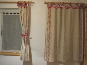 2人の部屋は道路に面して並んでるから外から見たとき同じカーテンでそろってないとめぐるんぱ的にイヤかも。。。と思ってレースじのものは麻素材のシンプルな物でループつきに~♪