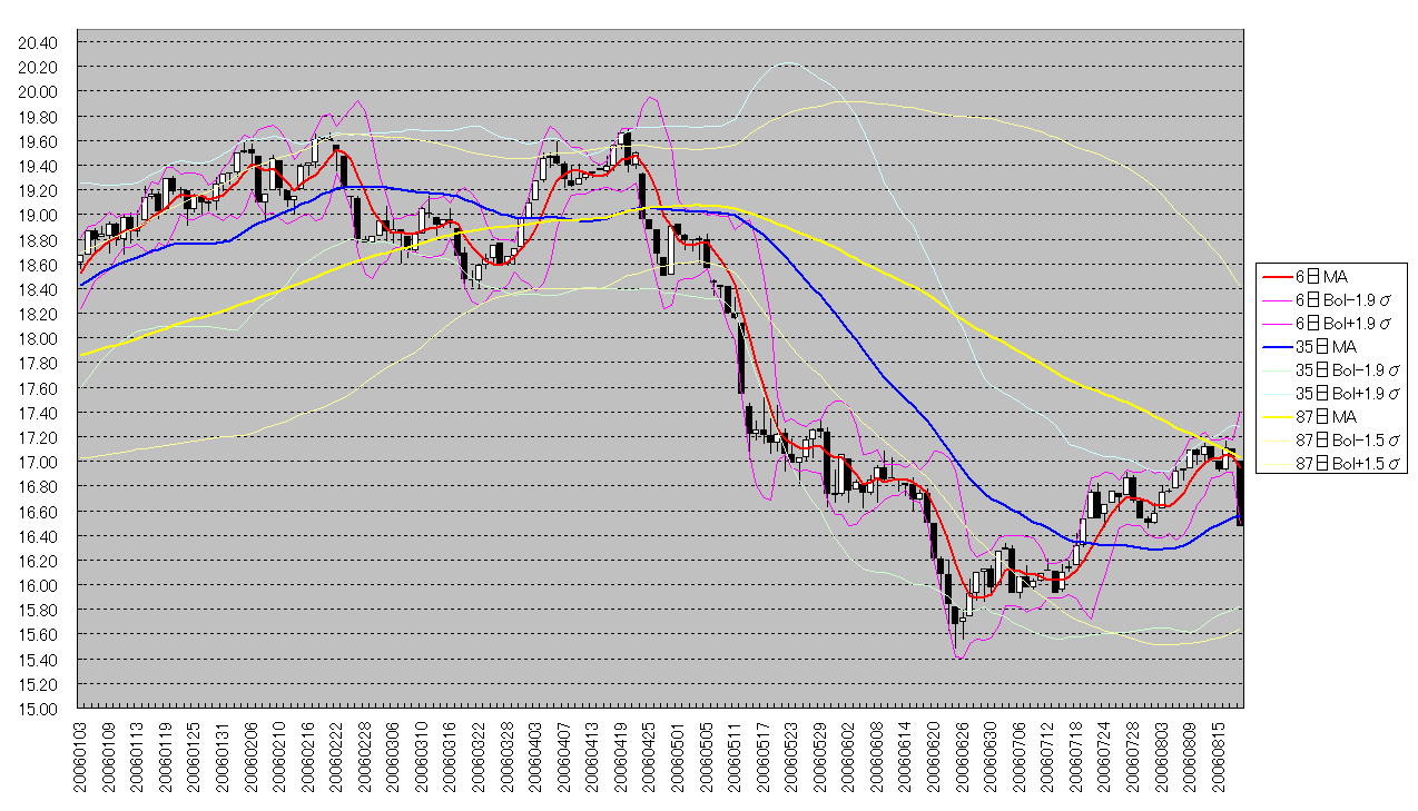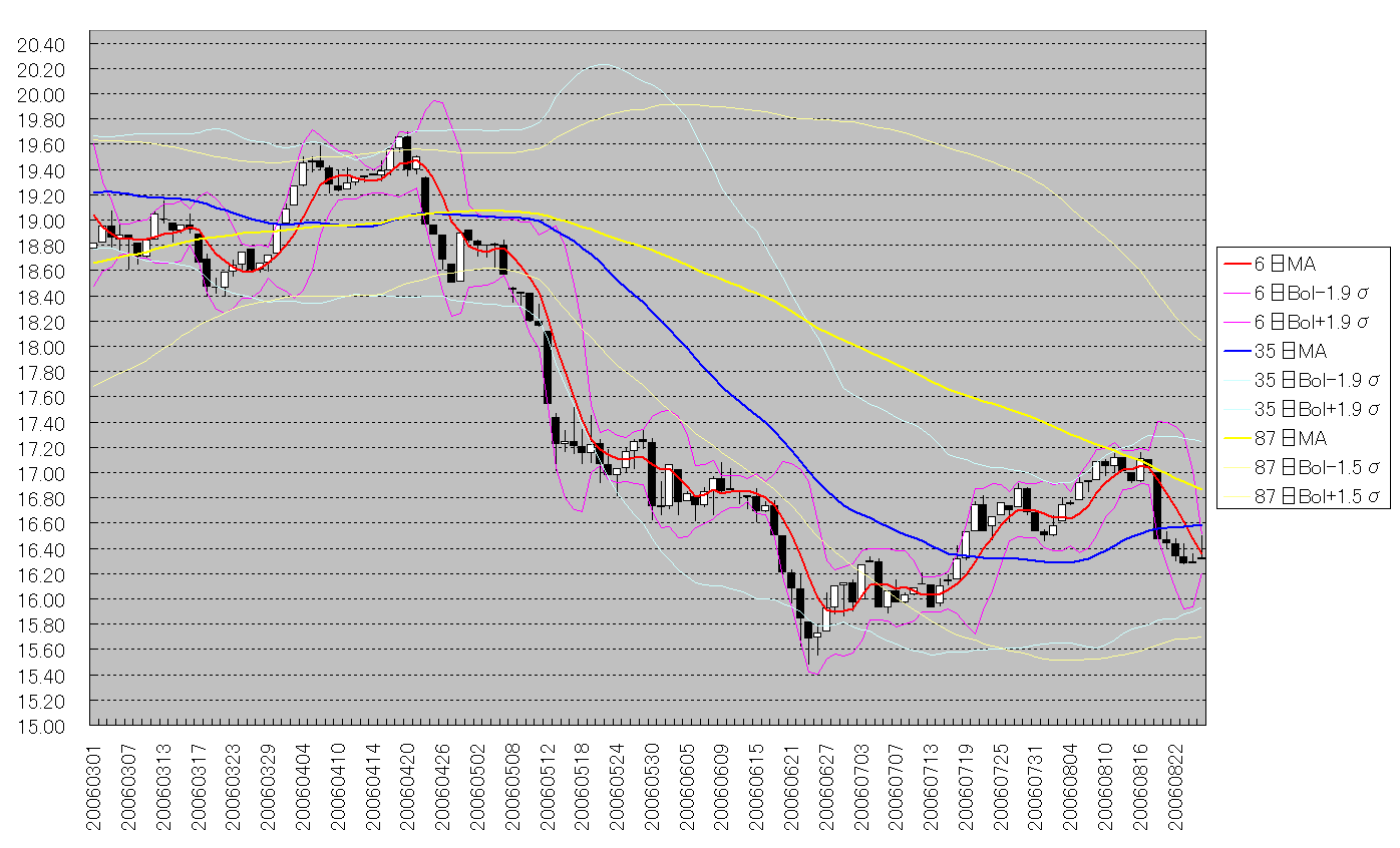 南アフリカ通貨 ランド/円(ZAR/JPY)のチャート分析です。 お願いチャート分析はシロートもいいとこです。どんなことでも結構ですので、コメントつけていただくとありがたいです。========ZAR/JPYのチャート(日足)日足1チャート 6日MA Bol1.9、35日MA Bol1.9、87MA Bol1.5入り(クリックで拡大)日足2チャート(クリックで拡大)RCI(PDF) 19日、43日、62日、78日入り ※RCIはRCI方向の転換時売買で、10%損きりでバックテストした結果日足1チャート(上図)ですが、17.1あたりにある ●87日MAに、ものすっげーきれいに跳ね返されました。。。。。 ●35日MAが、サポートしてくれることを祈ります。。。日足2チャート(下図)ですが、上昇(赤)の4波の底=16.5を割り込んでます。。。。。次は、上昇の2波の底=15.9~16あたりがサポートかな?RCIですが、19日も43日も、下がる気まんまん?長いほうも、あやしげ・・・・========ZAR/JPYのチャート(週足)週足ですが、今週はお休みです。。。PS.うー。健康診断で飲んだバリュームが、、、、、ふぅ。。。下剤がまーだ効いてるみただ。注:売買はくれぐれも自己判断でお願いしまそ先週の予想: ●南アフリカ通貨 ランド/円 ~08/11●TB先: にほんブログ村→為替この記事のカテゴリは「外国為替」です。過去の記事もご覧いただければ幸いです。<自分のスタンス>スワップメイン余裕残してる部分でちょろちょろ取引ブログランキング参加中。1日1回ぽちっとしていただけると、ありがたや~です【よんだよー】エリオット波動ビジネスサイクルはじめてのテクニカル分析相場の正しい捉え方マンガ相場の神様本間宗久(そうきゅう)翁秘録働かずに毎年1000万円稼げる私(わたし)の「FX」超活用術