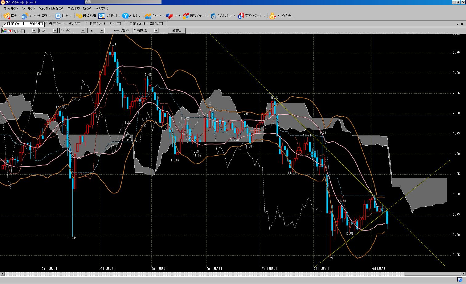 ランド円の日足チャートをみてみました。【2011/09/09 ランド円 日足】 つっつくと大きくなります。なーんかやな感じです。。。。ボリバンが狭くなっているところへきてなんか下方ブレイクしちゃっているような格好です。10.56~58あたりを下へぬけないことを祈りつつ、月曜の上げに期待したいかなと思います。そうすれば、薄い雲がまっているので付きぬけやすいかなぁと。(10.85あたりをぬけれれば・・・・)ついでに豪円もみてみました。【2011/09/09 豪円 日足】 つっつくと大きくなります。ざる円と同じですね。。。ただ、ざる円よりも雲の薄い箇所が近いです。ボリバンもすぐしたに控えてくれているのでサポートしてくれそうだし、なんとなく、雲を上ぬけやすそうな感じがします。遅行線もチャートにかかってるので、ちょっときつそうですが、ふんばってほしいな。注:これは予想ではなく、チャートみた感想です。よろしかったら、Twitterのフォローをお願いしますm(_ _)m@meime3By TwitterButtons.net
