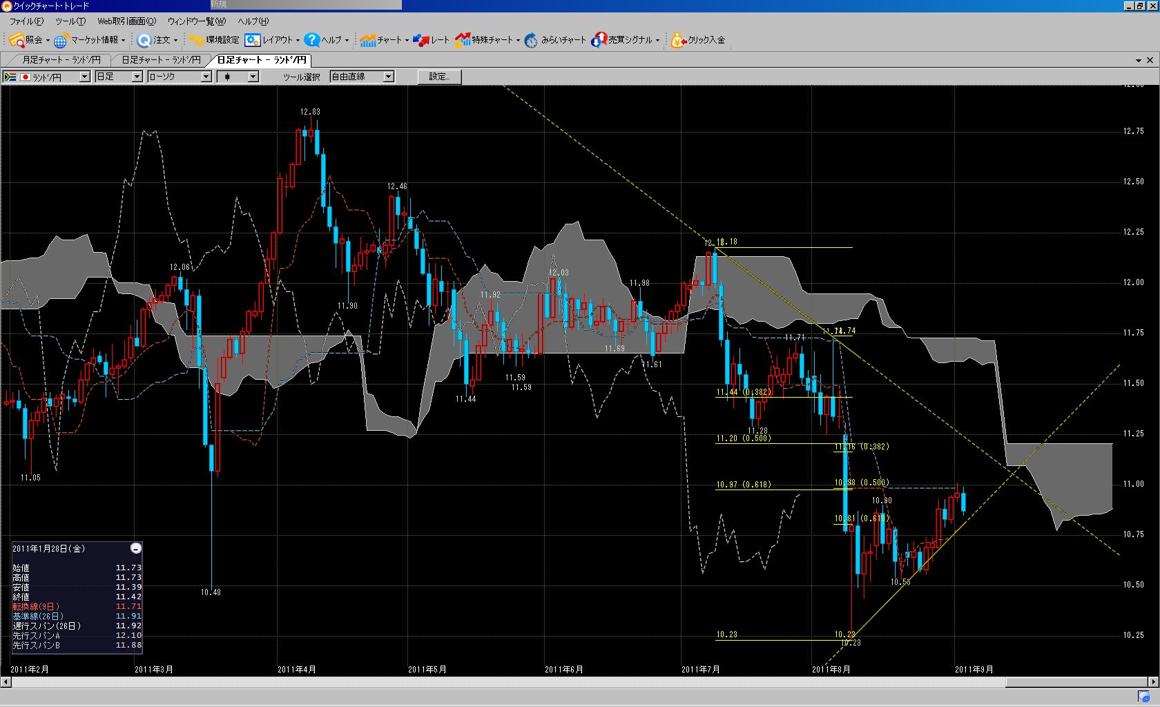 ランド円の日足チャートをみてみました。【2011/09/02 ランド円 日足】 つっつくと大きくなります。11円のところに基準線とフィボナッチがあるので、やっぱり11円は強固なレジスタンスになってるみたいですねぇ。。一応、転換線はサポートしてくれているようですが・・・・このまま、11円のところでもにもにしていたら、結構厚い雲の中をとおらなけりゃならないので、辛そうです。いつものごとく、これは予想ではなく、チャートみた感想ですので、なんの参考にもなりませんね。はは。すんません。よろしかったら、Twitterのフォローをお願いしますm(_ _)m@meime3By TwitterButtons.net