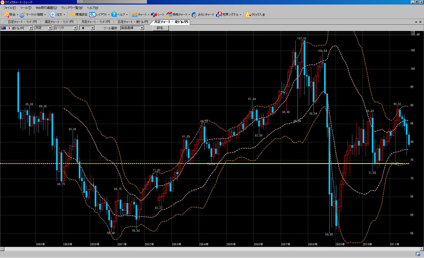 眠いのでちょっとだけ。。。豪ドル円の月足です。つっつくと大きくなります。黄色の横線は74LOWです。ダブルトップを形成しているので、ここを下抜けると最悪55くらいが見えてきてしまいます。ただ、ちょうど私が為替始めたころだったと思うのですが、少し長い期間76~78あたりをうろちょろとしたことがあるので、ここがサポートになるかもな~と思っています。じゃ!ねます。