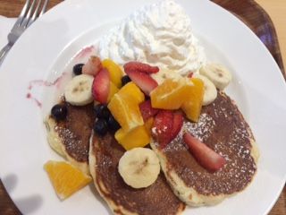 生クリームいっぱいで、フルーツはオレンジ、いちご、バナナ、ブルーベリー、マンゴーも乗ってました。
