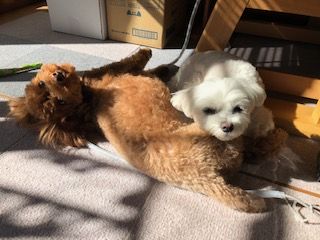 この時は、コナツがルウのお腹にアゴを乗せて寝ていました。写真を撮ろうと近づいたらふたりとも起きてしまったところを撮った、という状況です。