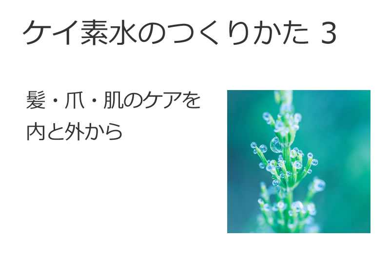 ケイ素水の作り方 3~髪・爪・肌のケアを内と外からこれまで2回にわたって、スギナから作る植物由来のケイ素水(チンキ)について解説してきました。今回は、美容やエイジングケアにも役立つスギナチンキの使い方を詳しく紹介します。自然の力は、内側からも外側からも私たちを整えてくれます。スギナはまさに「草の美容液」と言える存在なのです。■ケイ素は「美の土台」ケイ素(シリカ)は実は美容ととても深い関係があります。✅ コラーゲンの生成サポートケイ素はコラーゲン線維を束ね、肌のハリ・弾力を維持する役割を持っています。✅ 髪・爪の健康髪や爪の主成分ケラチンの構造安定にもケイ素が必要不可欠です。✅ 骨・血管・関節の強化内部の結合組織を支える役割があり、年齢による衰えを穏やかにサポートしてくれます。✅ 抗酸化サポート効果間接的に活性酸素を減らす働きも報告されています。■スギナチンキの内服法(美容目的)スギナチンキは「少量を日常的に取り入れる」ことでじわじわと効果が現れてきます。【内服の目安量】・1日5〜15滴程度・コップ1杯の水に滴下し、ゆっくり飲む・朝や昼の食事時に飲むのが習慣化しやすい※体質や胃腸の調子によって調整してOK継続することで、髪のツヤ・爪の強さ・肌のハリ感の維持をサポートしてくれるでしょう。■スギナチンキの外用法(肌ケア)チンキは内側だけでなく外側にも使えるのが特徴です。【希釈して使う方法】① コップ1杯の水に、チンキ5〜10滴を入れて薄める② そのままコットンやスプレーボトルに移して肌に軽く塗布③ 洗顔後や入浴後の清潔な肌に優しくなじませる※必ずパッチテスト(腕の内側などで少量塗布し様子を見る)を行ってから使用してください。肌に合わないと感じたら、すぐに使用を中止してください。アルコール濃度が高いので、原液を直接顔につけるのは避けましょう。必ず薄めて使用します。■髪や爪のケアへの直接的活用例内側からのケイ素補給が基本ですが、外側からのアプローチとしても活用できます。【髪のケア】・スプレーボトルに希釈したスギナチンキ(コップ1杯の水に5〜10滴)を作り、 洗髪後の髪に軽くスプレーします。・毛先や地肌に優しくなじませて乾かすと、 髪のまとまりやツヤ感をサポートしてくれます。【爪のケア】・希釈したスギナチンキをコットンに含ませ、爪や甘皮部分に優しくパッティングします。・マッサージするように軽くなじませると、 爪のしなやかさや割れにくさの維持に役立ちます。内服と外用を合わせることで、髪・爪・肌のトータルな美しさを底上げするケアが可能になります。 ■手作りスキンケア活用例ローションに数滴混ぜる・手作りクリームの水分相に利用・お風呂のお湯に10〜20滴加える(全身ケア)自然素材のミネラル分が肌の奥まで浸透するような感覚があり、使うたびにほんのり整う感じが実感できるでしょう。スギナチンキの美容活用まとめ利用方法期待できる作用内服髪・爪・肌の基礎からの栄養補助外用肌の引き締め・透明感・潤い感UP入浴全身のミネラル補給・リラクゼーション■最後に~植物の叡智を日常に取り入れよう市販の高額な美容サプリや特殊美容液に頼らなくても、自然界の植物たちは本来の力を惜しみなく私たちに与えてくれます。スギナはまさにその代表格。‘体内外から優しく整える「草の美容液」’として、ぜひ日々の暮らしに取り入れてみてください。