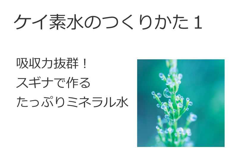 ケイ素水の作り方 1~吸収力抜群!スギナで作るたっぷりミネラル水「ケイ素水」と聞くと、専用の鉱石を使ったり、市販のボトル製品を思い浮かべる方も多いかもしれません。でも実はもっと自然で、しかも効率よく吸収できる方法があるのです。それがスギナ(つくしの親株)を使った植物由来のケイ素水です。この方法の最大の魅力は、ケイ素だけでなく、スギナに自然に含まれる多種類のミネラルやフィトケミカルもまるごと一緒に取り込めるところにあります。ミネラルは単体成分ではなく複合的に摂取する方が吸収されやすいとされ、自然の植物はまさにそれを実現してくれるのです。■スギナは「ケイ素の宝庫」スギナはケイ素(シリカ)含有量が非常に高いことで知られています。ケイ素はコラーゲンの維持や骨、皮膚、血管、爪、髪の健康に深く関わっていますが、食品から必要量を摂るのは意外と難しいのが現実です。自然に育ったスギナは、土壌のケイ素を自ら吸収し、しかも植物体内で無機ケイ素を有機ケイ素に変換して蓄えています。この「植物が組み替えたケイ素」は私たちの体にも非常になじみやすい形です。さらにスギナはケイ素だけでなく✅ マグネシウム✅ カルシウム✅ カリウム✅ 各種フィトケミカル✅ フラボノイドや微量元素なども豊富に含み、まさに草のマルチミネラル源とも言えます。■ケイ素チンキの作り方今回ご紹介するのは、スギナを使った**アルコール抽出(チンキ)**です。用意するもの・新鮮なスギナ(できれば農薬や犬猫の心配がない場所で採取)・35~40度のウォッカやホワイトリカー(果実酒用焼酎)・ガラス瓶(遮光瓶推奨)作り方① スギナを軽く洗い、水分をしっかり拭き取る(※水気はカビ防止のため重要)② 細かく刻み、瓶に1/3~半分ほど詰める(生葉の場合)③ アルコールをスギナが完全に浸かり、さらに1cm上くらいまで注ぐ④ 冷暗所で3〜4週間保管(時々瓶を優しく振る)⑤ 完成後はスギナを濾して保存。常温保存可能摂取方法・1日5~15滴程度を水に加え、ゆっくり飲む・サプリではなく、あくまで自然な草の濃縮ミネラル液として利用します。※より詳しい注意事項や使い方は次回以降でご紹介します。体質との相性がある場合もありますので、必ず1滴からスタートして様子を見ます。 ■おひたし・抽出液との違いと吸収効率スギナはおひたしや煮物でも摂取できますが、吸収経路に違いがあります。おひたし:消化管を経由 → 腸管吸収(やや吸収率が落ちる)チンキ(アルコール抽出):舌下吸収や胃粘膜吸収 → 直接血流に入りやすく即効性と効率が高いもちろん、どちらも有効です。食材としてのスギナもチンキも、組み合わせるとより総合的にミネラルを取り込めます。 ■植物由来と鉱物由来の違いケイ素水には鉱物由来の市販品も多く存在しますが、植物と鉱物には明確な違いがあります。植物由来(スギナチンキ)鉱物由来(市販ケイ素水)ケイ素の形有機ケイ素(変換済)無機ケイ素(原石由来)吸収率非常に高いやや低い他成分多種類のミネラル・フィトケミカル単体成分が中心価格圧倒的に低コスト高額商品が多い自然界は常に「複合的に摂る設計」になっています。植物まるごとの力は、抽出成分だけでは再現できない深みを持っています。 ■まとめ植物の叡智は本当にすごい。ケイ素を中心にしながらも、多くの栄養素がバランスよく含まれるスギナチンキは「草のミネラル水」として非常に優れています。自分の手で手軽に作れる自然の恵み。ぜひ次回以降でさらに詳しい実践方法、使用上の注意点について語ります。注意事項がありますので、この記事だけでなく、かならず2回目以降の記事も併せてお読み頂いてからご使用なさって下さいね!さらに第3回目にはスギナチンキの美容への応用法などをご紹介していきますので、楽しみにお待ちください!