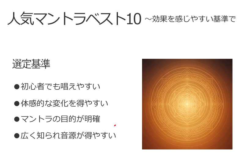人気マントラ ベスト10 ~効果を感じやすい基準で~本記事では、世界中で親しまれているマントラの中から、「効能がハッキリしていて、実際に唱える効果を感じやすいかどうか」という観点で選出したベスト10をご紹介します。マントラの選定には、以下のような基準を意識しています:初心者でも唱えやすい構成であること詠唱によって体感的な変化(心の落ち着き・元気の出現・場の浄化など)が起こりやすいこと健康、浄化、愛、金運、導きなど、目的が明確なもの現代でも実際に広く唱えられていて、YouTubeや書籍などで手軽に音源や情報が手に入ることそのため、「オーム(Om)」や「オーム・マニ・ペメ・フム(Om Mani Padme Hum)」のような世界的に有名なマントラでも、効果を体感しやすさの観点からは中盤〜後半の順位となっています。このランキングはあくまで一例であり、最終的には「自分の心にしっくりくるかどうか」が最も大切です。多くのマントラはYouTubeなどにアップされており、実際のリズム感や発音を聞いてから唱えるのがおすすめです。まずは耳から入れて、響きを体で感じてみてください。それでは、光の音の旅をはじめましょう✨■第1位:ガヤトリーマントラ(Gāyatrī Mantra)読み方(ローマ字): Om Bhur Bhuvaḥ Swaḥ Tat Savitur Vareṇyaṃオーム ブール ブヴァハ スヴァハ タット サヴィトゥール ヴァレーニャムBhargo Devasya Dhīmahi Dhiyo Yo Naḥ Prachodayātバルゴー デーヴァスヤ ディーヒマヒ ディヨー ヨー ナハ プラチョーダヤート意味・紹介: ヒンドゥー教における最も神聖とされるマントラ。太陽神サヴィトリを讃え、真理の輝きによって私たちの知性が導かれるように祈る。主な効能:精神浄化と集中力の向上真理と叡智へのアクセス金運・仕事運・健康運などあらゆる開運効果 ■第2位:光明真言(こうみょうしんごん)読み方(ローマ字): On abokya beiroshano makabodara mani handoma jimbara harabaritaya unオンアボキャベイロシャノウ マカボダラ マニ ハンドマ ジンバラ ハタバリタヤ ウン意味・紹介: 大日如来の光明により、業障(カルマ)を消し去るとされる真言。密教系の真言の中でも広く知られ、唱えるだけで身体・心・空間が清められると言われる。主な効能:厄除け・浄化心の平穏と保護邪気を払い、運気を上げる深い安心感をもたらす ■第3位:マハームリチュンジャヤ・マントラ(Maha Mrityunjaya Mantra)読み方(ローマ字): Om Tryambakam Yajamahe Sugandhim Pushtivardhanamオーム トリヤンバカン ヤジャーマヘー スガンディン プシュティヴァルダナンUrvarukamiva Bandhanan Mrityor Mukshiya Maamritatウルヴァールカミヴァ バンダナーン ムリティヨール ムクシーヤ マーアムリタート意味・紹介: 「死を超えるマントラ」とも呼ばれ、病気や災難からの解放、長寿と再生を祈るために用いられる。シヴァ神に捧げられた強力なマントラ。主な効能:病気平癒・健康回復命の保護・延命再生と癒しの力深いトラウマや恐れからの解放■第4位:ナヴァ・グラハ・マントラ(Navagraha Mantra)読み方(簡略)Surya:太陽 Om Suryaaya Namah オーム スーリャーヤ ナマハChandra:月 Om Chandraaya Namah オーム チャンドラーヤ ナマハMangal:火星 Om Kram Kreem Kroum Sah Bhaumaya Namah オーム クラン クリーム クラウム サハ バウマーヤ ナマハ Budha:水星 Om Bram Breem Broum Sah Budhaya Namah オーム ブラン ブリーム ブラウム サハ ブダーヤ ナマハGuru:木星 Om Gram Greem Groum Sah Gurave Namah オーム グラン グリーム グラウム サハ グラヴェー ナマハShukra:金星 Om Dram Dreem Droum Sah Shukraya Namah オーム ドラン ドリーム ドラウム サハ シュクラーヤ ナマハShani:土星 Om Pram Preem Proum Sah Shanaye Namah オーム プラン プリーム プラウム サハ シャナイェー ナマハRahu:ラーフ:昇交点 Om Bhram Bhreem Bhroum Sah Rahave Namah オーム ブラン ブリーム ブラウム サハ ラーフェー ナマハKetu:ケートゥ:降交点 Om Sram Sreem Sroum Sah Ketave Namah オーム スラン スリーム スラウム サハ ケータヴェー ナマハなど、9惑星ごとに異なるマントラを唱える意味・紹介インド占星術で用いられる「9惑星(ナヴァ・グラハ)」に捧げるマントラ群。惑星の悪影響を和らげ、人生運を整えるために使われる。この9つのマントラを、それぞれの曜日・星座・運勢などに応じて使い分けることができる。とくに「今ちょっと運気が不安定かも…」と感じるときは、Shani(土星)やRahu・Ketuのマントラを唱えるとバランスが取りやすくなるとも言われている。(ご要望があれば今後詳細な記事にします)主な効能星まわりや運勢の改善特定の不運・停滞の解除様々な局面でのバランス回復■第5位:オーム・マニ・ペメ・フム(Om Mani Padme Hum)読み方Om Mani Padme Humオーム・マニ・ペメ・フム(ペメ→ペメーと伸ばすこともあり)意味・紹介観音菩薩の慈悲の象徴とされるチベット仏教のマントラ。「蓮華の中の宝珠よ」という詩的で深い意味を持つ。主な効能慈悲の心を育てる執着や怒りを和らげるハートチャクラの癒し困難な状況へのやさしい導き■第6位:オーム・ナマ・シヴァーヤ(Om Namah Shivaya)読み方Om Namah Shivayaオーム・ナマ