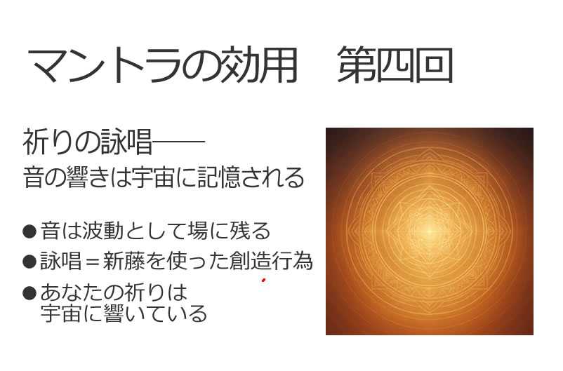 脳科学的観点から見たマントラの効用とは?第1回:マントラが脳に与える影響とは? マントラとは、サンスクリット語で「心(manas)を解放する(trana)」という意味を持つ言葉です。 言霊としてのマントラは、古代から心と意識を整えるために使われてきました。けれど、最近では脳科学や神経科学の分野でも、 マントラが脳や心に与える実際の影響が、少しずつ明らかになってきています。今回は、「マントラが脳に与える影響とは何か?」というテーマで、 科学とスピリチュアルの接点にある“言葉と音の力”を4回シリーズで紐解いていきます。■雑念が減る仕組み:脳のDMN(デフォルトモードネットワーク)私たちの脳は、何もしていないときにも、絶えず内側で思考を続けています。 この内的なおしゃべりに関係しているのが、「デフォルトモードネットワーク(DMN)」という脳領域です。このDMNは、過去の後悔や未来への不安、他人との比較など、 不必要な雑念や思考を生み出す傾向があります。しかし、マントラを唱えることで、このDMNの活動が抑制されるという研究結果があります。 特定の音とリズムを繰り返すことで、脳が“今ここ”に集中し、 不要な思考を鎮める方向に切り替わるのです。■脳は同時に2つのことをできない」=マントラの力が発揮される理由脳には“選択的注意”という仕組みがあります。つまり、同時に複数の処理をしようとすると、実は一瞬ずつ切り替えているだけなのです。だから、もし頭の中に雑音があふれていても、マントラを唱えることで意識をそこにしか向けられなくなるようにできています●こんなふうに働く雑念(心配・後悔・妄想) ⬇マントラ詠唱で「声・リズム・呼吸・音」に意識を固定 ⬇脳は「雑音を処理するリソースがなくなる」 ⬇結果として、心が静まり“いまここ”に戻ってくるそして、これは単に“気をそらす”のではなく、“心の場”を調律するという、脳科学に基づいたとても高度なセルフケアなのです。■前頭前皮質が活性化されるマントラを唱えている間、脳の前頭前皮質(prefrontal cortex)が活性化されることが確認されています。 この部分は、注意力・意思決定・感情のコントロールなど、 高次な思考を担う場所です。つまり、マントラは“落ち着く”だけでなく、 意識を明晰にする方向へも作用するのです。定期的なマントラ瞑想により、集中力が高まり、思考が整理され、 ストレスに流されにくい「安定した精神状態」を育てることができます。 ■音の振動が脳と神経伝達物質に作用する音とは、空気の振動です。 自分の声でマントラを唱えると、その振動が身体全体に伝わり、 脳にもダイレクトに影響を与えます。特に、音の振動が神経細胞に働きかけ、 セロトニンやドーパミンといった「幸せホルモン」の分泌を促すことが報告されています。これは、気分の改善や、落ち着いた気持ちをもたらすだけでなく、 脳の機能そのものを最適化する助けにもなります。また、音の繰り返しによって脳がリズムに同調することで、 深い瞑想状態やリラクゼーションが得られることもわかっています。■自分の“声”が最も強いヒーリングツールになる興味深いのは、他人の声ではなく「自分の声」でマントラを唱えるとき、 その癒し効果がさらに高まるという点です。声は、喉・胸・頭部などを震わせることで、 身体の内部に「共鳴」し、振動として届きます。これは外からの音楽では得られない、内側からの整えとも言えるでしょう。つまり、マントラは「唱えること」自体が、 自分で自分を癒すエネルギーワークなのです。おわりに:マントラは“脳と心の再調律”マントラは、スピリチュアルな修行や宗教的儀式だけでなく、 現代の私たちの心と脳に、確かな「再調律の効果」をもたらします。科学的に見ても、マントラには:雑念を静める脳を整える幸せホルモンを促す内側からの共鳴を起こす という多面的な効能があるのです。次回は、マントラの“音そのもの”がどのように脳を刺激し、 深い集中とリラクゼーションをもたらすのかを、 「サンスクリット語と音の力」というテーマで掘り下げていきましょう。