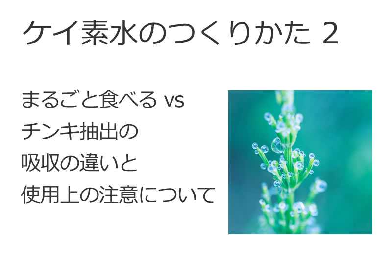 ケイ素水の作り方 2~まるごと食べる vs チンキ抽出の吸収の違いと使用上の注意について前回は、植物由来のケイ素水としてスギナチンキの作り方をご紹介しました。今回は、「おひたしなどで食べる方法」と「チンキ抽出」の吸収の違いについて、もう少し詳しく解説していきます。スギナを活用する時、多くの方が「お茶にする」「おひたしにする」「煮込んで食べる」など、食材として活用することを思い浮かべるでしょう。もちろんこれも素晴らしい方法です。でも吸収のルートが違うことで、体内に入るミネラルの量や種類が少し変わってくるのです。これはスギナに限らず、どの植物や食品についても言えることですので知っていると役に立つかもしれません。■食べて摂る場合(おひたし・煮物・お茶)スギナは食材としても利用できます。野草料理やお茶にして楽しむ人も多いでしょう。これらは、消化管(胃・腸)を通じて体内に取り込まれます。【吸収経路】口 → 胃 → 小腸 → 腸管吸収【メリット】・他のビタミンや食物繊維もまとめて摂れる・腸内環境が整っていれば多くの栄養素が吸収される・食事の一部として気軽に取り入れやすい【弱点】・ケイ素は腸での吸収率が10〜20%程度とやや低め・細胞壁が硬く、完全に分解されないまま排出される部分もある👉 食材利用のメリット・加熱による雑菌・寄生虫対策が容易・多種のビタミン・食物繊維が摂取できる・胃腸が強い人には総合的な恩恵あり■チンキ(アルコール抽出)で摂る場合アルコール抽出によって細胞壁が溶け、スギナに含まれるケイ素や他の微量成分がしっかり抽出されます。摂取時は舌下や胃粘膜から直接吸収されるため、消化を経ずにスムーズに血流に取り込まれます。【吸収ルート】舌下・口腔内 → 血流または 胃粘膜 → 直接血中移行【メリット】・ケイ素吸収率が高く、少量で効果が期待できる・舌下や胃粘膜から直接吸収されるため即効性もある・微量元素・フィトケミカルもまとめて取り込める【注意点】・アルコールに弱い方は量を調整する・妊娠・授乳中は医師と相談 吸収の図式イメージ(簡易まとめ)方法吸収率主な吸収経路食べる(おひたし・お茶)低~中小腸からの消化吸収チンキ(アルコール抽出)高舌下・胃粘膜から直接吸収実は「併用」がいちばん良い!どちらか一方に偏らず、「食べる」「飲む」「チンキで摂る」など複数の方法を組み合わせるのが理想的です。食材として摂ることでビタミン・食物繊維も摂れますし、チンキではケイ素や微量成分を効率よく取り込めます。【私の実践例】おひたし・煮物+毎日少量のチンキ数滴 ■使用上の注意まとめ(簡易版)✅ 野草採取は自己責任で安全確認を行う ・丈夫で育てやすいので、自分で育てるのが一番良い。 ・採取場所の農薬や衛生面などに注意。 特に駐車場や道路脇などは除草剤を撒くことが多いので注意が必要 ・他の人の土地で採取する場合は特にひとことお断りするなどのマナーが必要✅・スギナとトクサ類の誤認に注意しましょう (スギナは胞子茎が春につくし状で出ます)。✅ アルコール濃度は35~40度を推奨 果実酒用のホワイトリカーやウォッカなどを使用します。✅ 妊娠中・授乳中・持病のある方は医療機関に相談してから使用してください✅ 舌下吸収を高める飲み方について・直接舌下に垂らし、15〜20秒ほど口の中に含んでから飲みこむ・水や飲み物に混ぜた場合でも、15〜20秒ほど口の中に含んでから飲み込みます。・高温の飲み物は避け、常温〜ぬるま湯が理想的です・これによって、舌下・口腔粘膜からの吸収率が高まります・熱い飲み物に混ぜるのは避けてください。 (成分が揮発・分解する可能性があるため。水かぬるま湯がベスト)✅ どんな植物でも、体質との相性というものはあります。 最初は1滴から始めて、大丈夫であることを確認しながら 少しずつ量を増やしてください。(1日の上限15滴まで)■ツクシと併用は可か否か?根の部分は使用可能?チンキ作成には、スギナの葉・茎などの緑色の栄養茎部分を使用するのが基本です。ツクシ(胞子茎)部分はチンキには向かず、混入は避けるのが理想的です。ツクシには微量のアルカロイド成分やビタミンB1分解酵素(チアミナーゼ)が含まれており、通常のおひたし等で少量食べる分には問題ありませんが、濃縮抽出するチンキでは安全面から除外するのが望ましいです。また、地下茎(根茎)部分は葉や茎ほどミネラルは豊富でなく、タンニンなど渋み成分も含まれるため、チンキ抽出には使用しません。地下茎はむしろ、乾燥・粉砕して軟膏や入浴剤など外用目的で活用する方が適しています。このように、緑の地上部(葉と茎)だけを使うことで、ケイ素をはじめとする豊富なミネラル成分を安全かつ効率よく抽出できます。 次回は、美容にも効果のあるスギナチンキ活用法についてお伝えします。